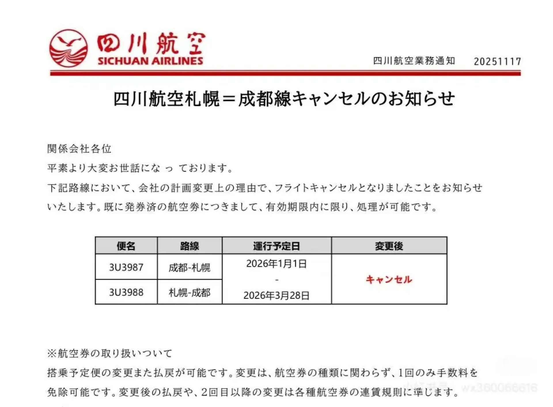 3 F; i% }, c/ o! B! _1 S. S$ k公仔箱論壇內地極目新聞11月17日報道,四川航空已取消2026年1月1日至2026年3月28日期間,成都往返札幌的航班。(網上圖片)5.39.217.769 u, i$ C/ t7 s/ C% c; M