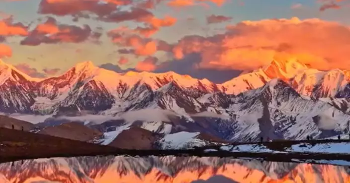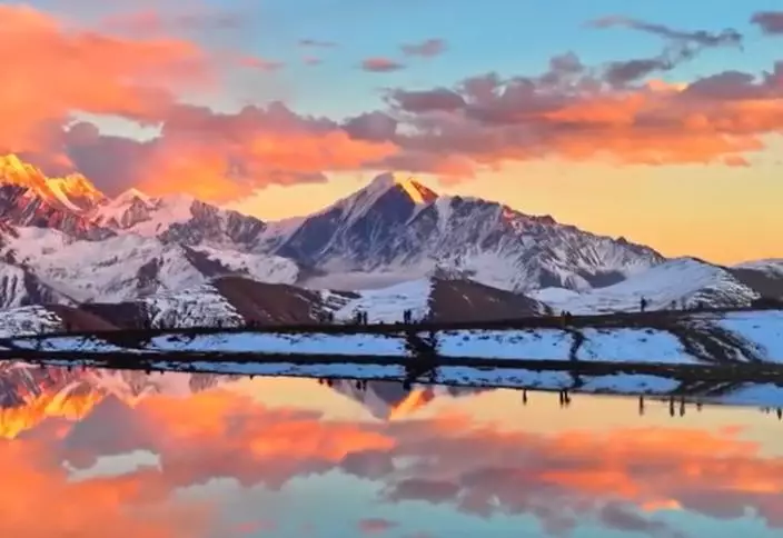 人民日報香港近日分享短片,片中可見貢嘎雪山在日出時被霞光照亮,雪峰逐層變成金色。現場雲層流動,光線折射在湖面上,形成幾乎對稱的「雙