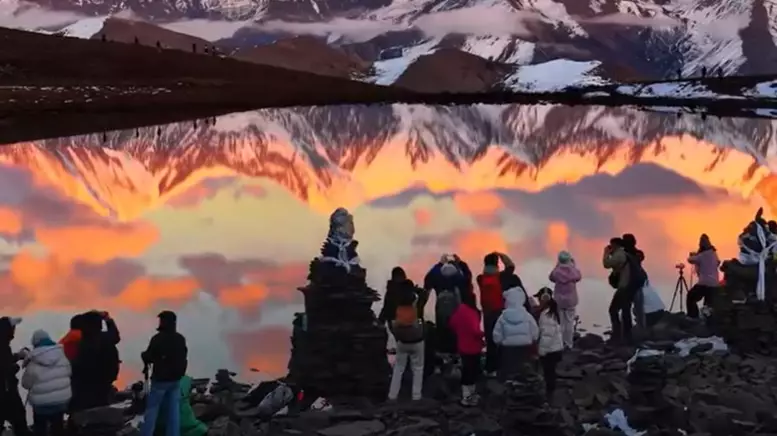 從片段所見,拍攝地點湖面平靜得近乎無風,大批旅客天未亮已排在湖邊等候,希望捕捉到完整倒影。有遊客舉機連環快門,亦有人架起腳架拍攝延時短片,務求留住最完美瞬間。