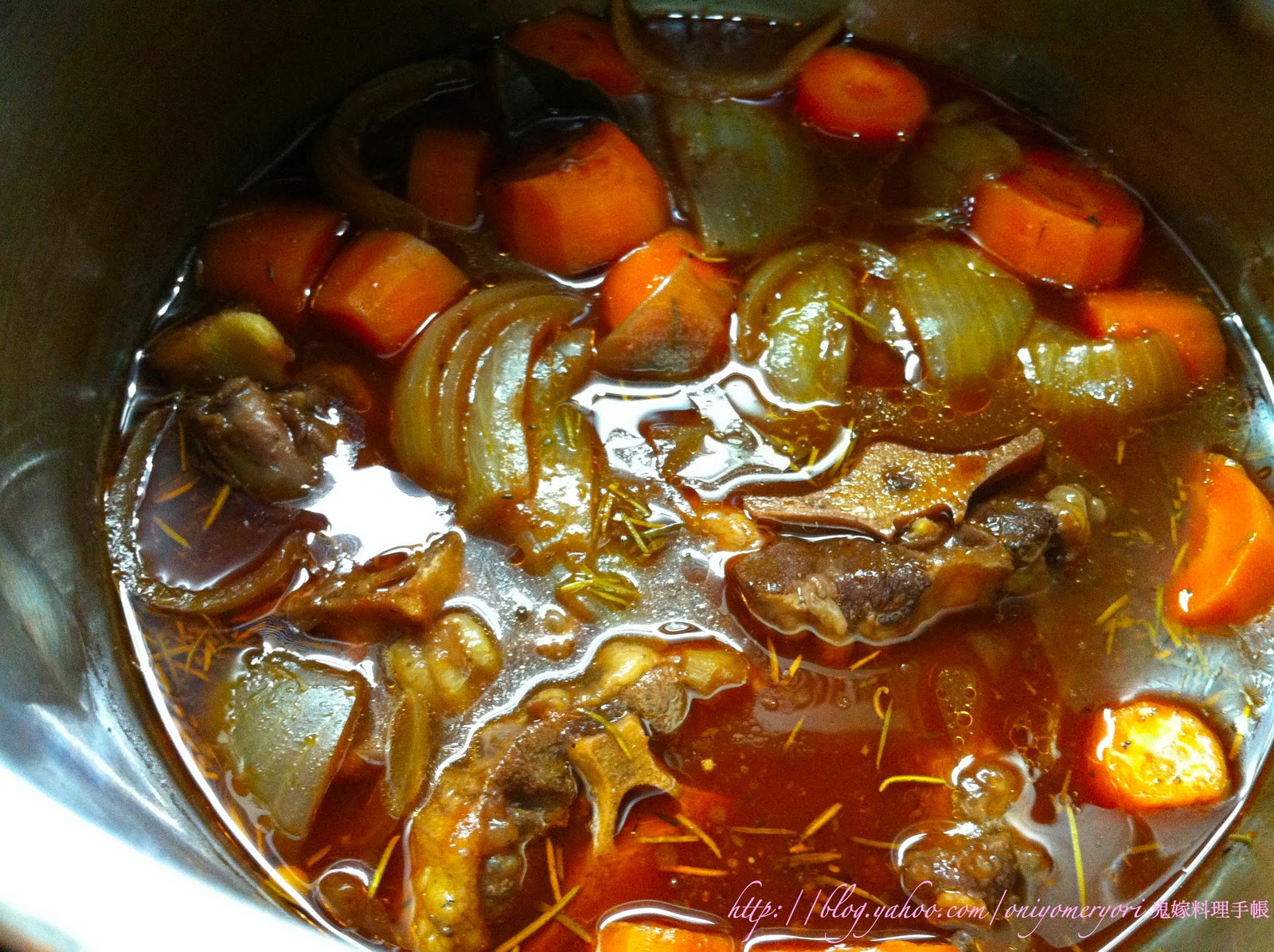 6 r' m1 S* A3 }3 J& A" ?公仔箱論壇3) 壓力煲或平底深鍋燒滾1碗水 ,煮溶牛湯粒,加入牛尾、紅酒、罐裝蕃茄、洋蔥、甘荀、蕃茄、 香葉、蕃膏、原條百厘香、迷迭香及7碗水拌勻