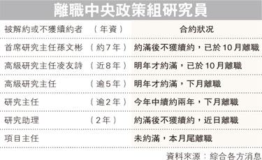 ; X# J, i. w3 y5 g9 M5.39.217.76邵善波今年7月起執掌中策組。據悉,在8、9月國民教育風波時,中策組已傳出「換血」,至今有6人被「踢走」,當中2人約滿後不獲續約,其餘4人尚有合約在身,有人剛於年中獲前朝政府續約兩年。目前有3人已正式離職,包括年資七八年的首席及高級研究主任孫文彬及凌友詩,其餘3人陸續在未來一個月離開(見表)。