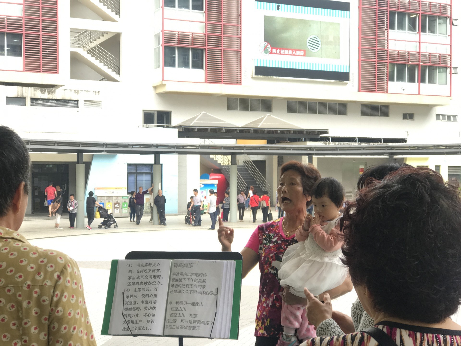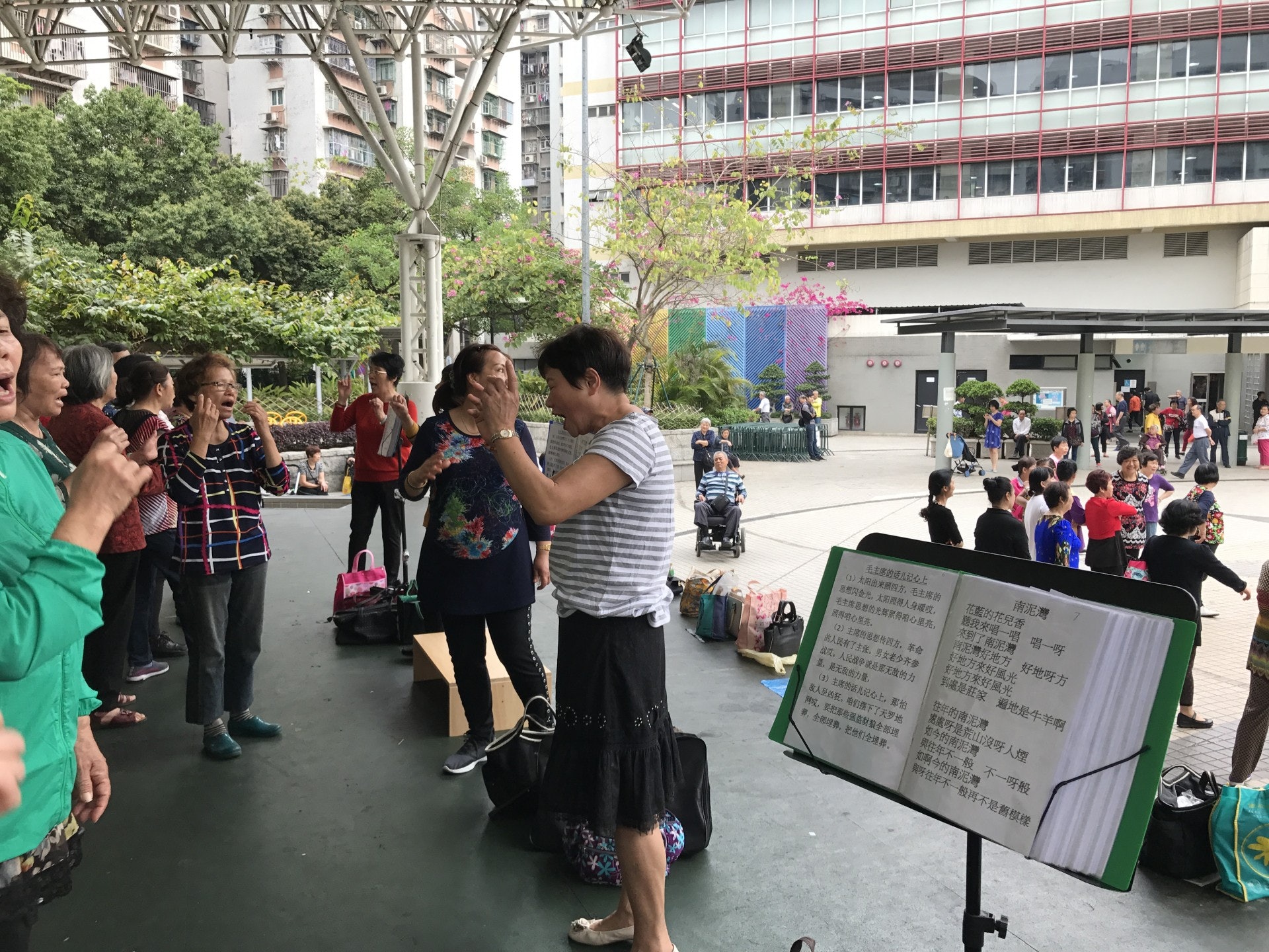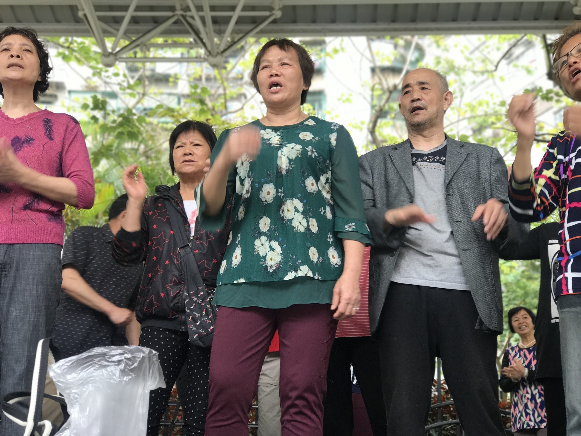 4 x* _% H4 P$ D: b2 o一下子,一個個年約60餘歲的大媽、大叔從四方八面一湧而來,如習慣地放下街市的購物袋等行裝,在三個領唱者及自備歌詞曲譜的協作下, 60人以純人聲,聲勢浩蕩地高唱《毛澤東的話兒記心上》,效果震撼。記者以分貝機去量度聲響,不時停留在80多分貝,即如尼加拉瓜大瀑布的流水聲,值得一提的是,祐漢公園被四周的民居包圍着,故相信居民位位成為聽眾。5.39.217.76/ U# ^/ O6 Z) Q7 Q