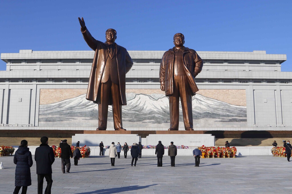+ [1 j! F0 x3 E& }1 J0 p/ R* W# C朝鮮新冠肺炎疫情:圖為1月1日民眾來到平壤萬壽台紀念碑,在朝鮮兩位已故領導人銅像下方獻花。(AP)
