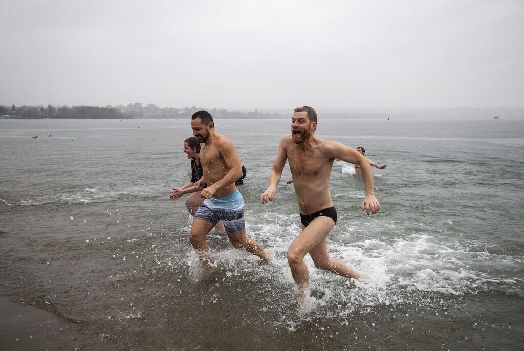 $ P1 e, E _1 G5 l* O, i( Htvb now,tvbnow,bttvb加拿大新冠肺炎疫情:本在溫哥華舉行「北極熊冬泳」因疫情取消了,但有些人在1月1日仍不畏嚴寒,跳進冰冷的海中游泳。(AP)