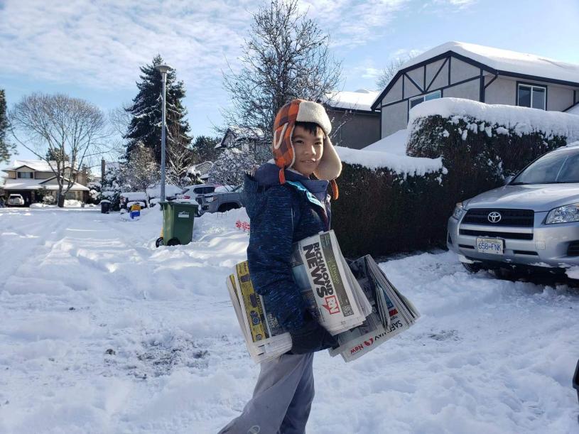 % m% F) c( b" h- q# j2 G; ktvb now,tvbnow,bttvb列治文居民胡先生,每周四都必須要陪著8歲的兒子育愷,去送社區報紙。胡先生周三看到氣象說會下大雪,已經給兒子心理建設了,告知兒子會很辛苦,要他加油。早上看到厚厚大雪,兩父子就開始鏟雪,接著挨家挨戶送報紙。胡先生講述稱,其中最困難的地方是路面的行人道、坑洞和台階等都看不清楚,所以有兩三次兒子幾乎都跌倒了。胡先生笑著說,他自己覺得挺累,但沒想到兒子一點也不覺得苦,很開心地完成了他送報紙的工作,「這對孩子來說是很好的磨練,讓他知道很多人都必須在惡劣天氣下工作的,應該要懂得感恩。」