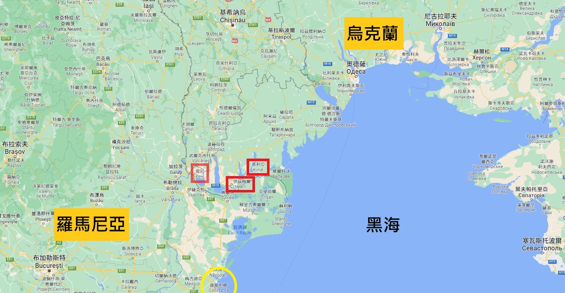3 \0 ]1 z. D5 C圖中紅框為烏克蘭在多瑙河上的三個主要港口,圖下黃圈是羅馬尼亞的康斯坦察港(Constanța)。(Google Map)公仔箱論壇) g6 K$ i2 ~, V, Y$ `2 {0 Z4 f