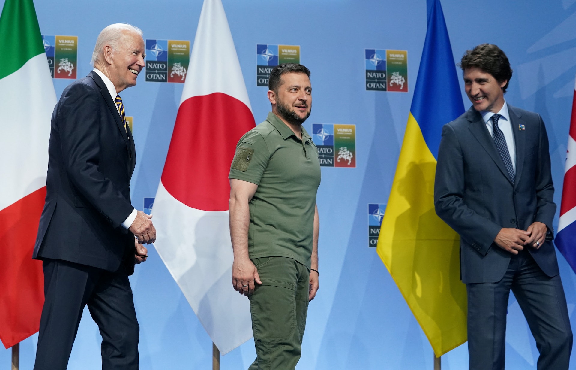 美國總統拜登(左)、烏克蘭總統澤連斯基(中)、加拿大總理杜魯多(右)2023年7月12日在立陶宛出席北約峰會(Reuters)