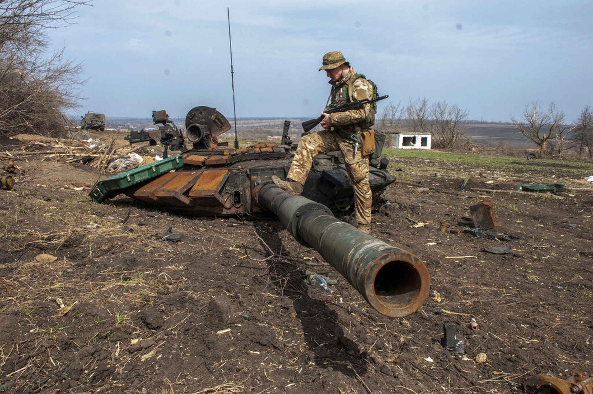 * |6 K( S m' y) W; T公仔箱論壇烏克蘭局勢:圖為2022年4月1日,烏克蘭一名軍人腳踏在一部已被摧毀的俄羅斯坦克上。照片攝於哈爾科夫州名為Malaya Rohan的鄉村附近。(AP) |