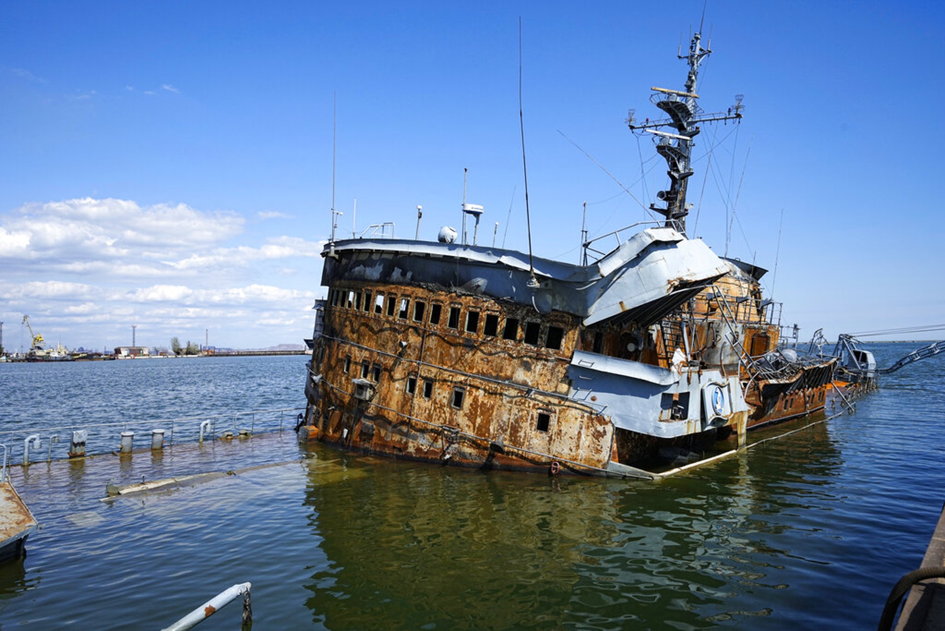 5 D) A+ o7 K2 J- a: Q4 \& Gtvb now,tvbnow,bttvb烏克蘭局勢:圖為2022年4月29日,位於馬里烏波爾港範圍一艘沉沒的戰艦。記者是參加由俄國防部安排的一個訪問團,並在途中拍下這張照片。馬里烏波爾絕大部份地方已落入分離分子手中。(AP)