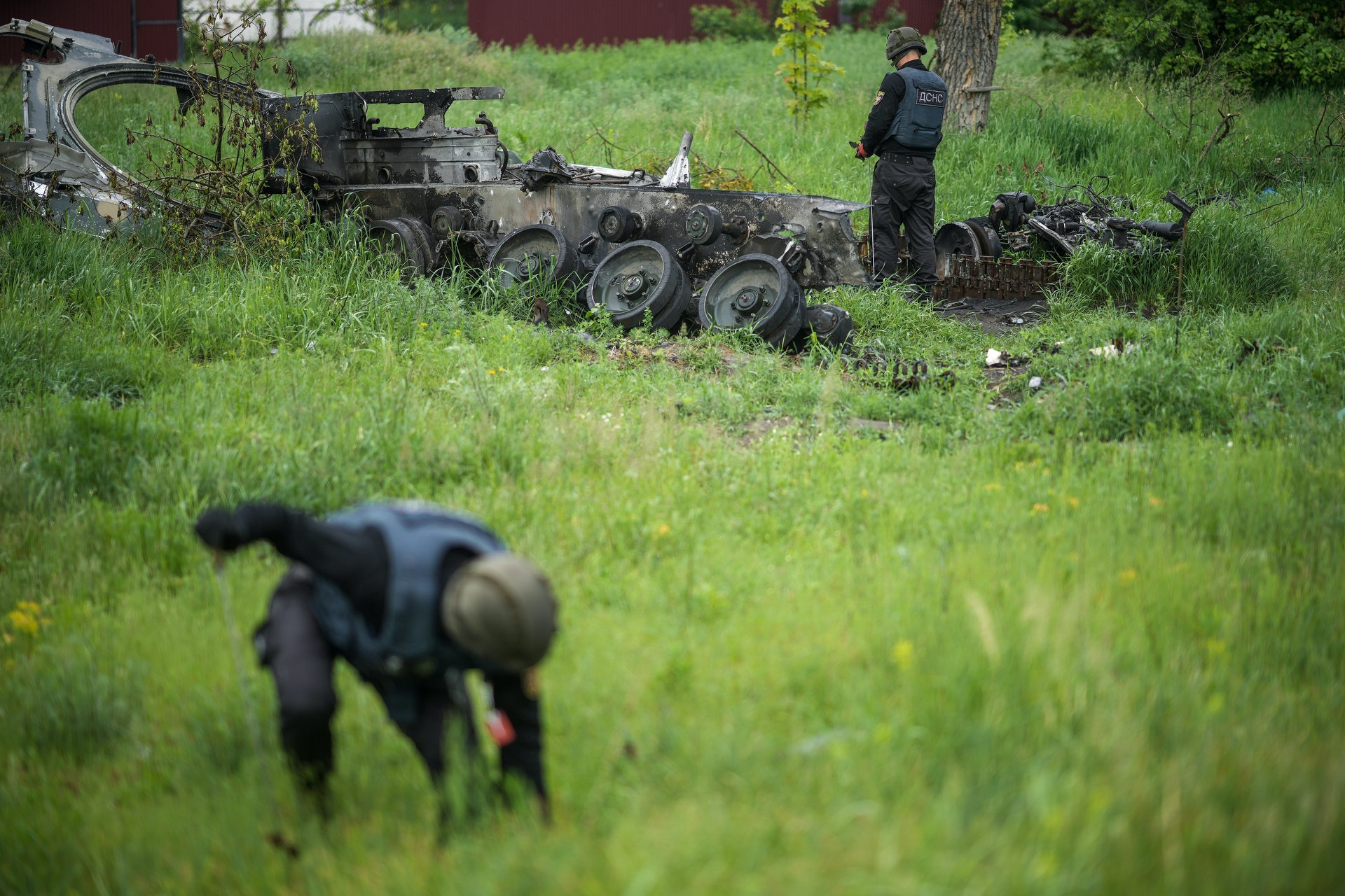 2 [- b% N4 }9 a, c. b- _: ~# b! B; ]5月31日,烏克蘭博羅江卡,拆彈專家檢查一輛被擊毀的俄羅斯裝甲車,搜索可能散落在四周的危險爆炸品。(Christopher Furlong/Getty Images)0 e8 s' K( D" E3 \! a+ C$ E. ]
