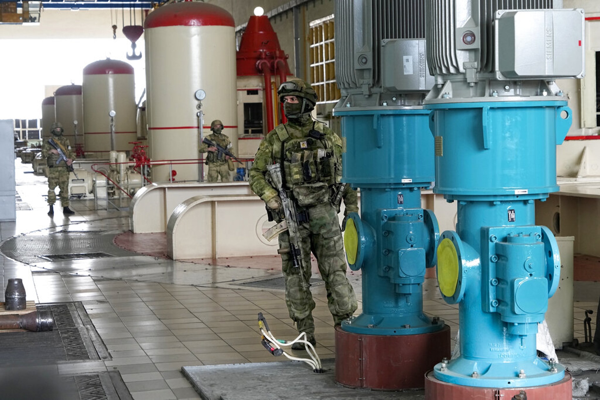 2 M, z) E- M. r" Z# ^( g軍事專家馬特維耶夫認為,具體何時開始從赫爾松撤退沒有太大的影響。關鍵是要在烏軍發動決定性的攻擊之前進行,以免部隊陷入險境。圖為2022年5月20日,一名俄軍在卡霍夫卡水力發電廠的機房站崗。這個水力發電廠位於烏克蘭赫爾松州(Kherson )的第聶伯河(Dnieper River)。) I# k+ _# R0 d5 O/ I# X