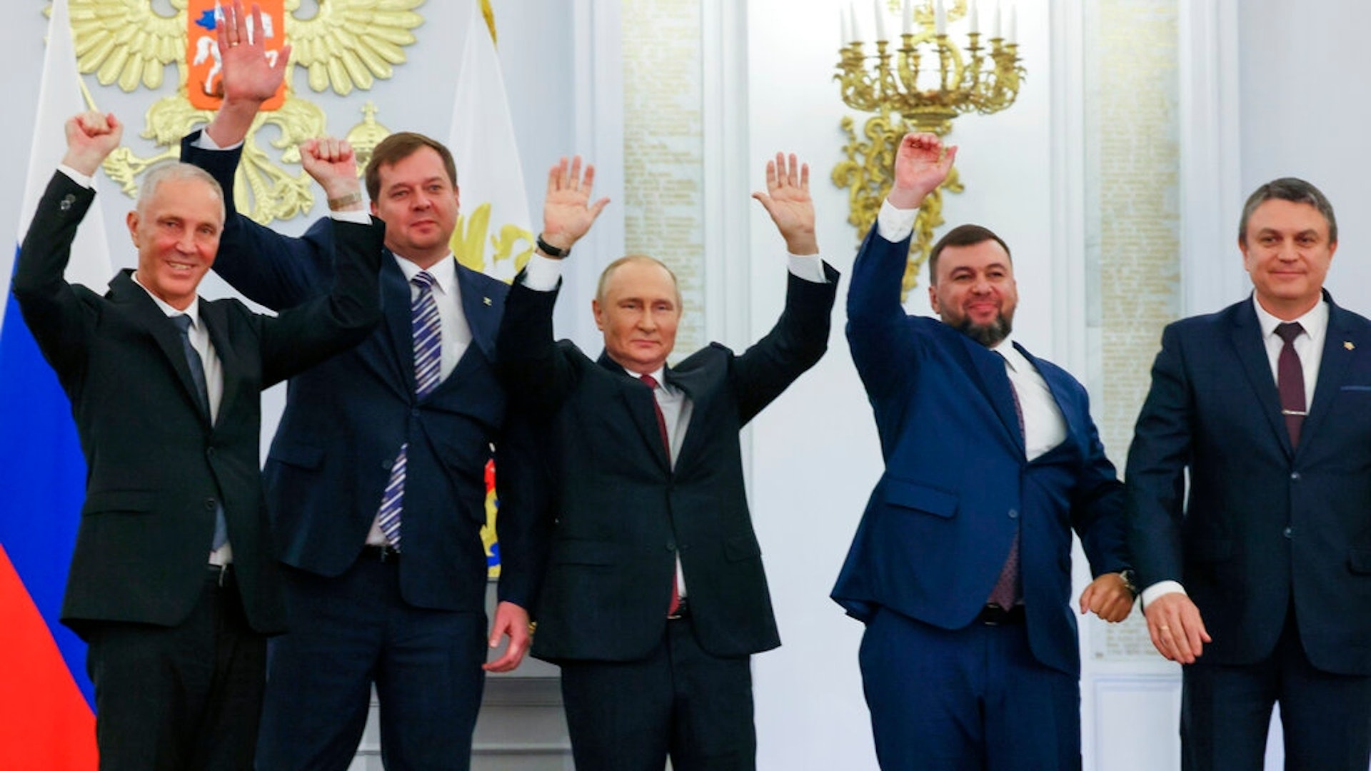 U& c! O" \0 Y/ M# G$ M$ S俄羅斯吞併烏克蘭4地區:圖為2022年9月30日,左起由俄羅斯委派的赫爾松州首長薩爾多(Vladimir Saldo)、由俄羅斯委派的扎波羅熱州首相巴利茨基(Yevgeny Balitsky)、俄羅斯總統普京、頓涅茨克領導人普希林(Denis Pushilin)及盧甘斯克領導人帕舍尼克(Leonid Pasechnik)出席協議簽署議式,並一同向在場人士揮手。(AP)TVBNOW 含有熱門話題,最新最快電視,軟體,遊戲,電影,動漫及日常生活及興趣交流等資訊。, v5 |" _# O0 B e