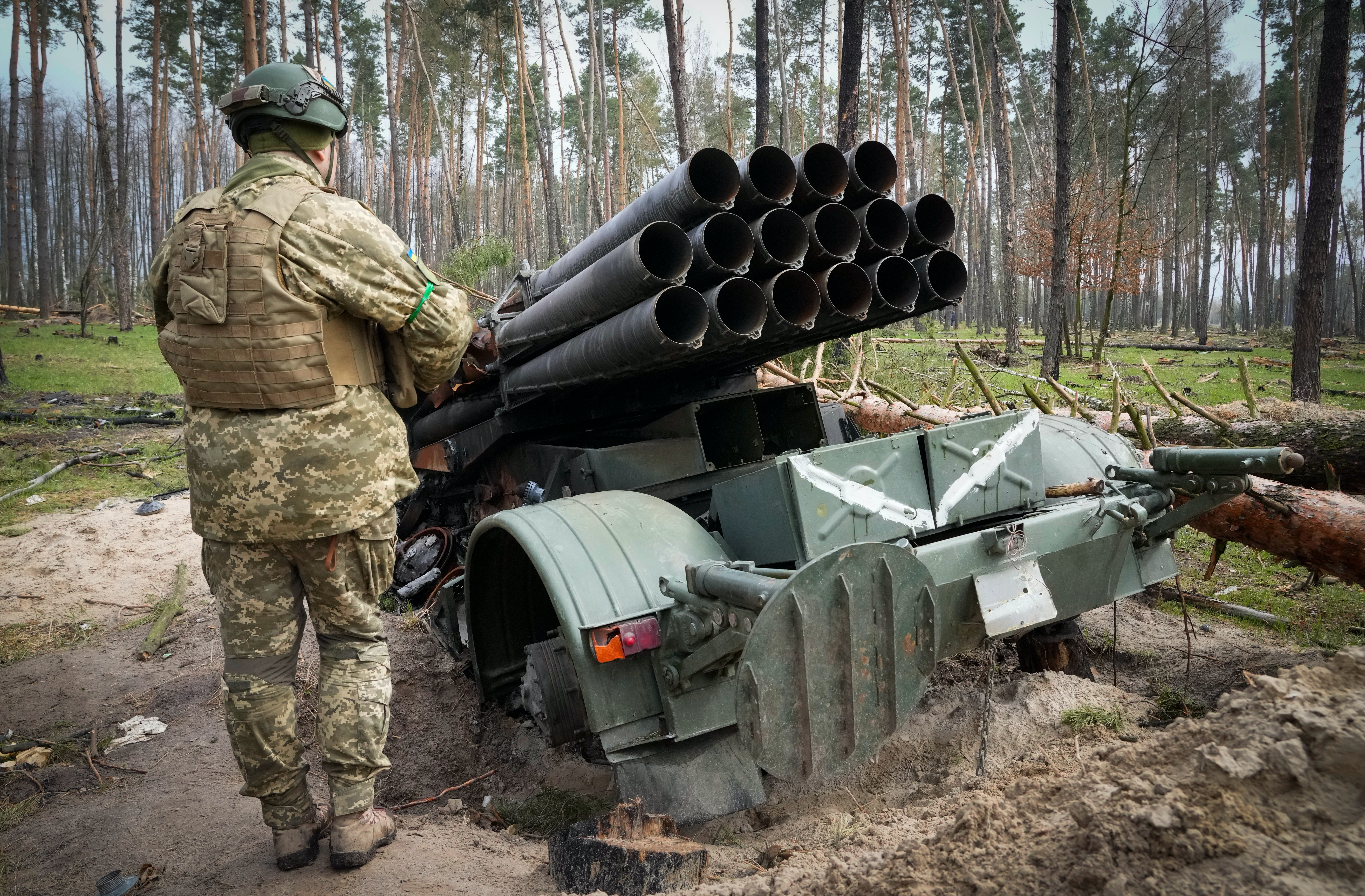 ) Z' K1 K( c, S% Y! i) htvb now,tvbnow,bttvb烏克蘭別列濟夫卡村,一名烏克蘭士兵正在檢查被俄羅斯軍隊遺棄的俄羅斯多管導彈系統。(美聯社照片/ Efrem Lukatsky)