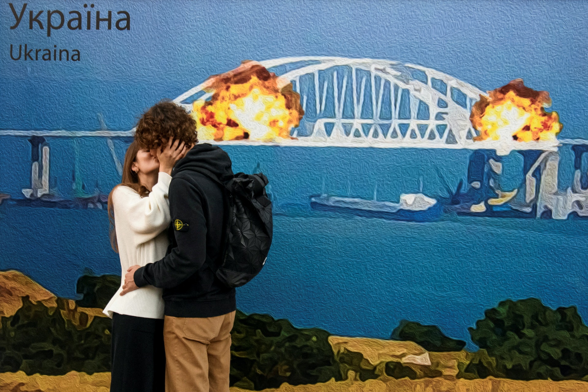 ; w+ w4 N J6 t/ X ~2 ^- A, N3 s: W圖為2022年10月8日,烏克蘭基輔一對男女在一幅壁畫前擁吻。壁畫描繪俄羅斯興建的克里米亞大橋2022年10月8日被炸的情形,吸引不少烏克蘭人前來「打卡」。(Reuters)