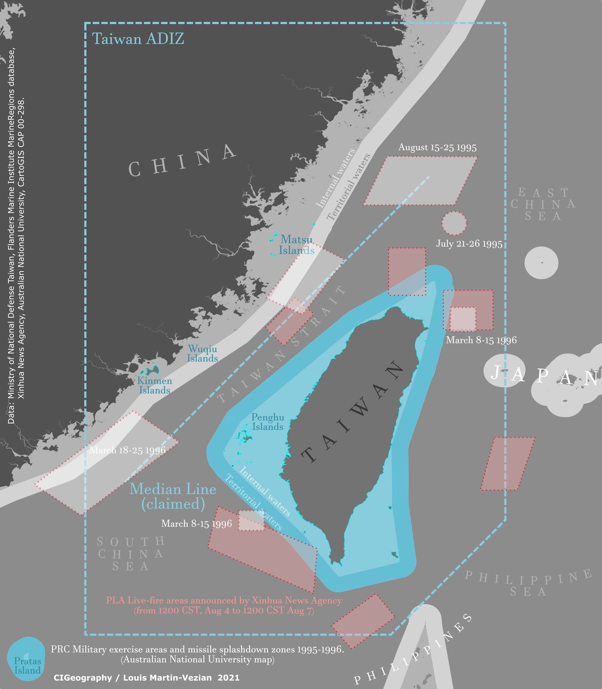 9 l4 v# Q5 {" T( V- b5 ]5.39.217.76時政與地理網(CIGeography)繪製的地圖,顯示了解放軍將進行的「重要軍事演訓行動」與「實彈射擊」,規模將超越1996年台海危機,甚至跨越了台灣的領海、內水與防空識別區。(Twitter@CIGeography)