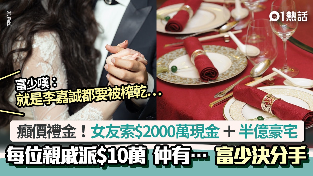 【結婚/禮金】這是結婚還是賣身?就算遇上富二代追求,女生一旦「獅子開大口」也會落得慘淡下場!內地近日熱傳,暱稱「上海嚴公子」的男子於網上分享被江西女友家庭要求支付1888萬元(人民幣,下同,約2,200萬港元)現金作禮金,而且約值4,500萬元(約5,200萬港元)的婚房必須過戶到女方名下,更要給每位親戚10萬元(約11.7萬港元)紅包,女家還直言知道男家有多少身家,認為要求並不過份,而女友更完全支持父母的決定。最終富少堅持只付百萬元禮金及准許女友在加婚房加名,雙方談判決裂後,沒料到遇到上海封城令2人分隔兩地,但女方繼續擺出高傲姿態,最終令富少心淡又心寒,堅決提出分手。公仔箱論壇8 l" L, H8 G* f2 j' f0 j8 Y