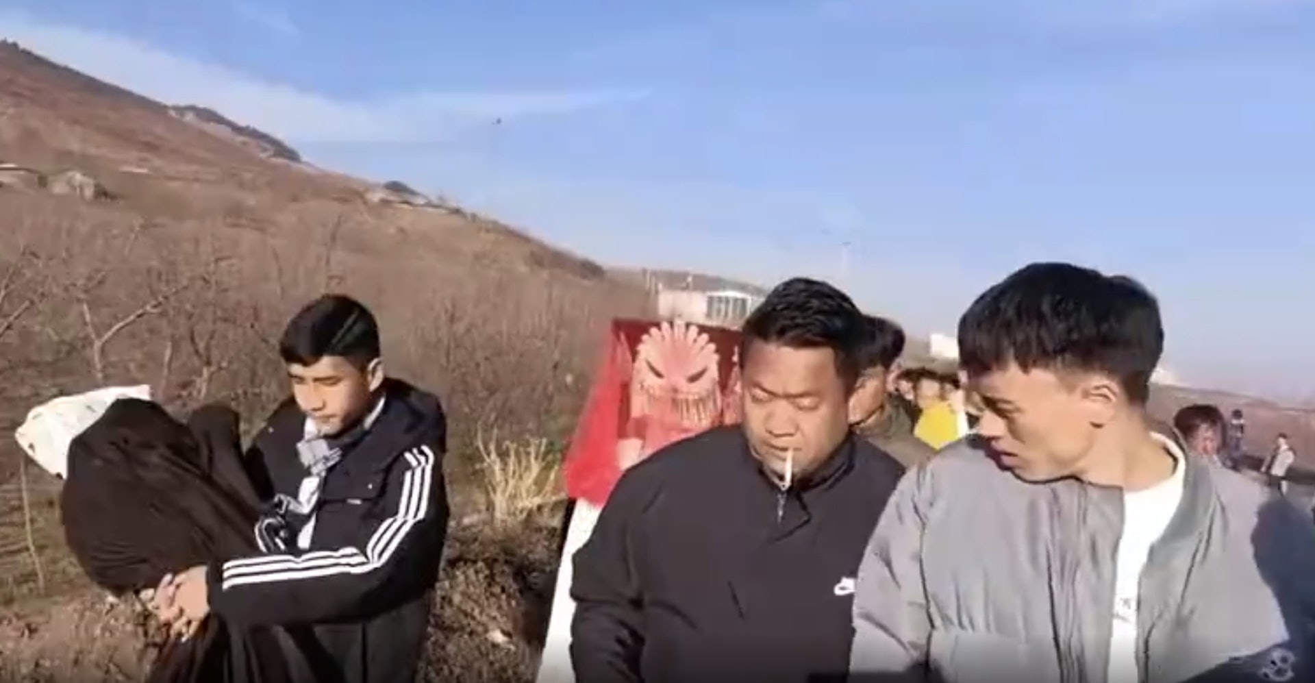 最後在近百人浩浩蕩蕩的「送嫁」開心隊伍中,只有當新娘的女孩笑不出來,還流露無奈死神般無奈眼神。