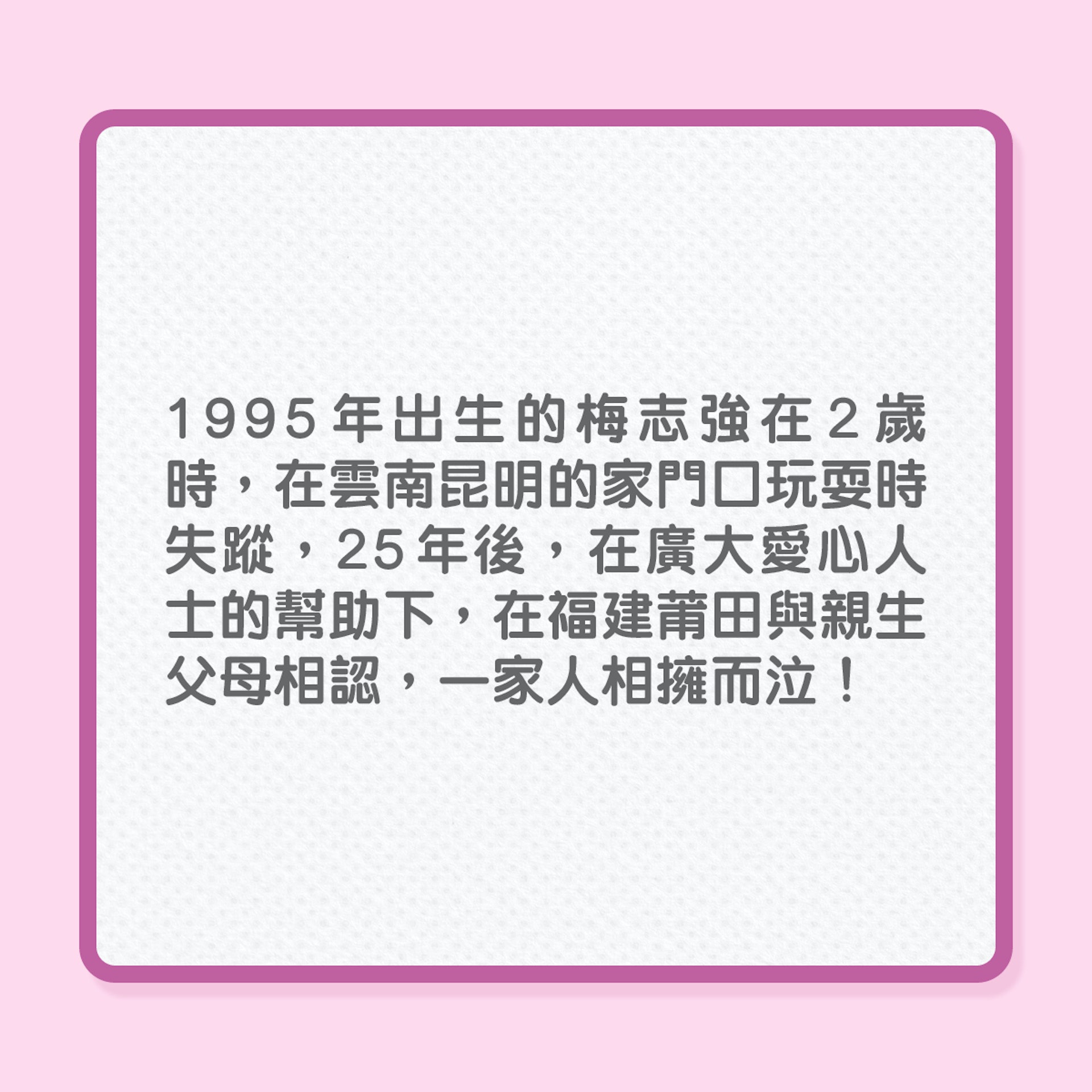 綜合內媒報道,1995年出生的梅志強在2歲時,在雲南昆明的家門口玩耍時失蹤,25年後,在廣大愛心人士的幫助下,在福建莆田與親生父母相認,一家人相擁而泣。