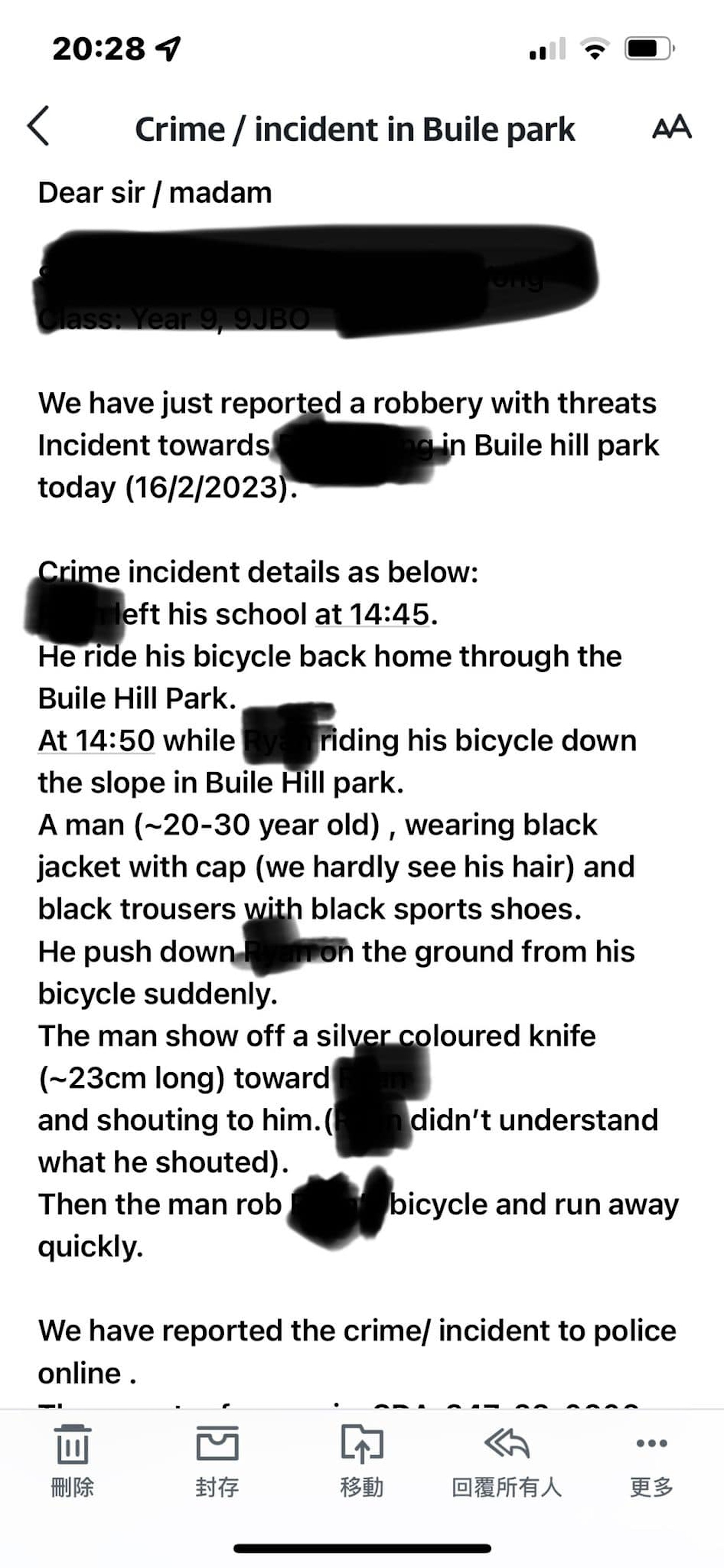 從樓主上載有關搶單車的報案訊息見到,其兒子當日下午2時45分騎單車回家,在「Buile Hill Park」落斜時,遭1名穿黑衣戴帽、年約20至30歲男子推跌,並亮出約23厘米長的刀威嚇及大叫,之後便搶走單車逃去,相當離譜。公仔箱論壇, G" T5 G' d% t; Z" O" T