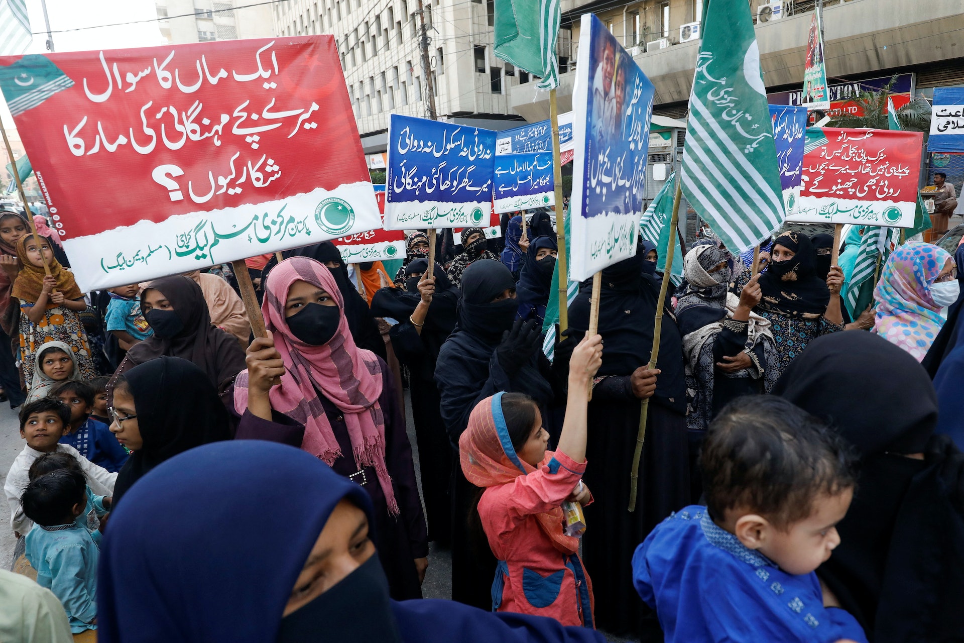 / g- T4 X4 _! V0 o* N2023年2月15日,巴基斯坦首都卡拉奇有婦女帶同孩子上街示威,抗議政府抑制物價不力。(Reuters)公仔箱論壇7 E! g' g& [/ n5 T% w$ U