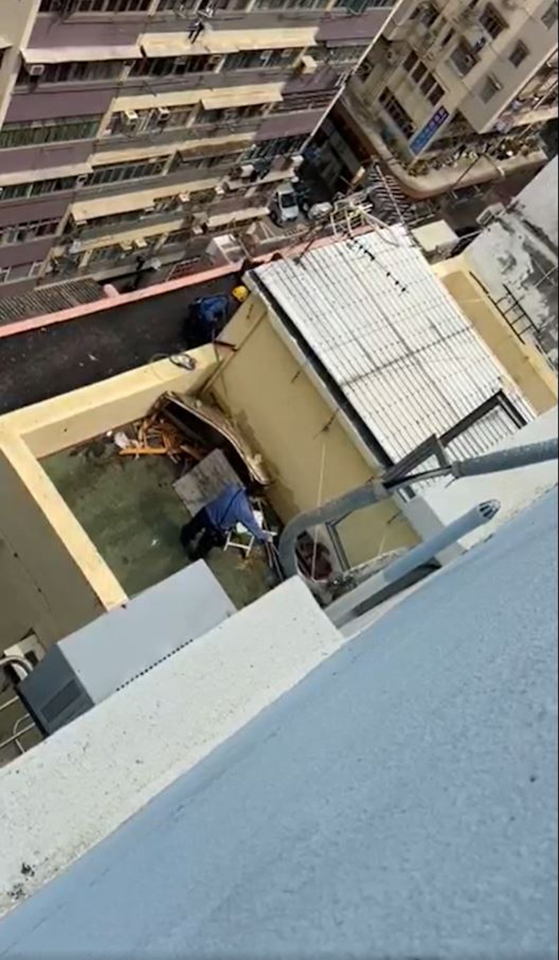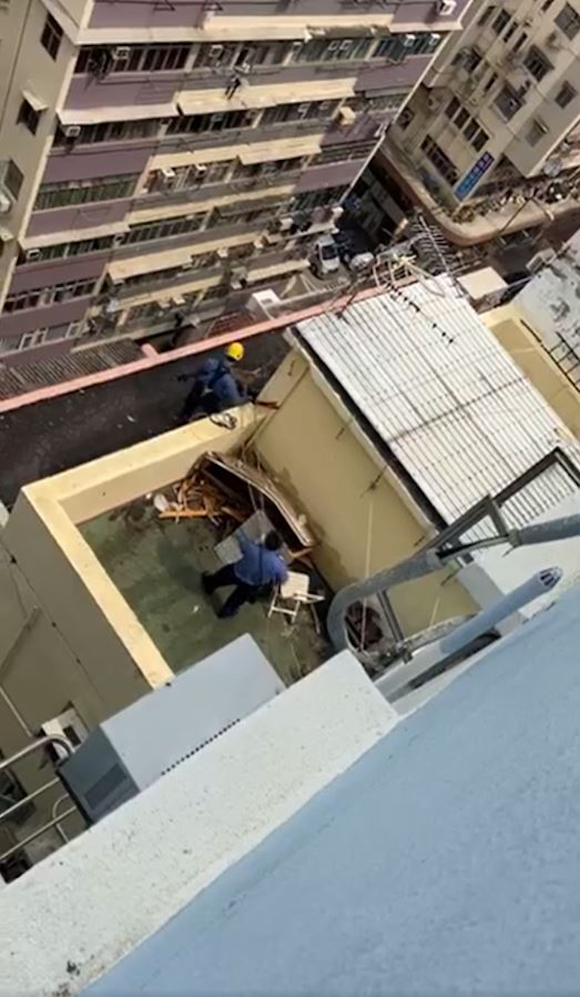 愛協及消防走出天台簷篷,走近被困狗隻。(網民KT Chan上傳至深水埗街坊會FB)