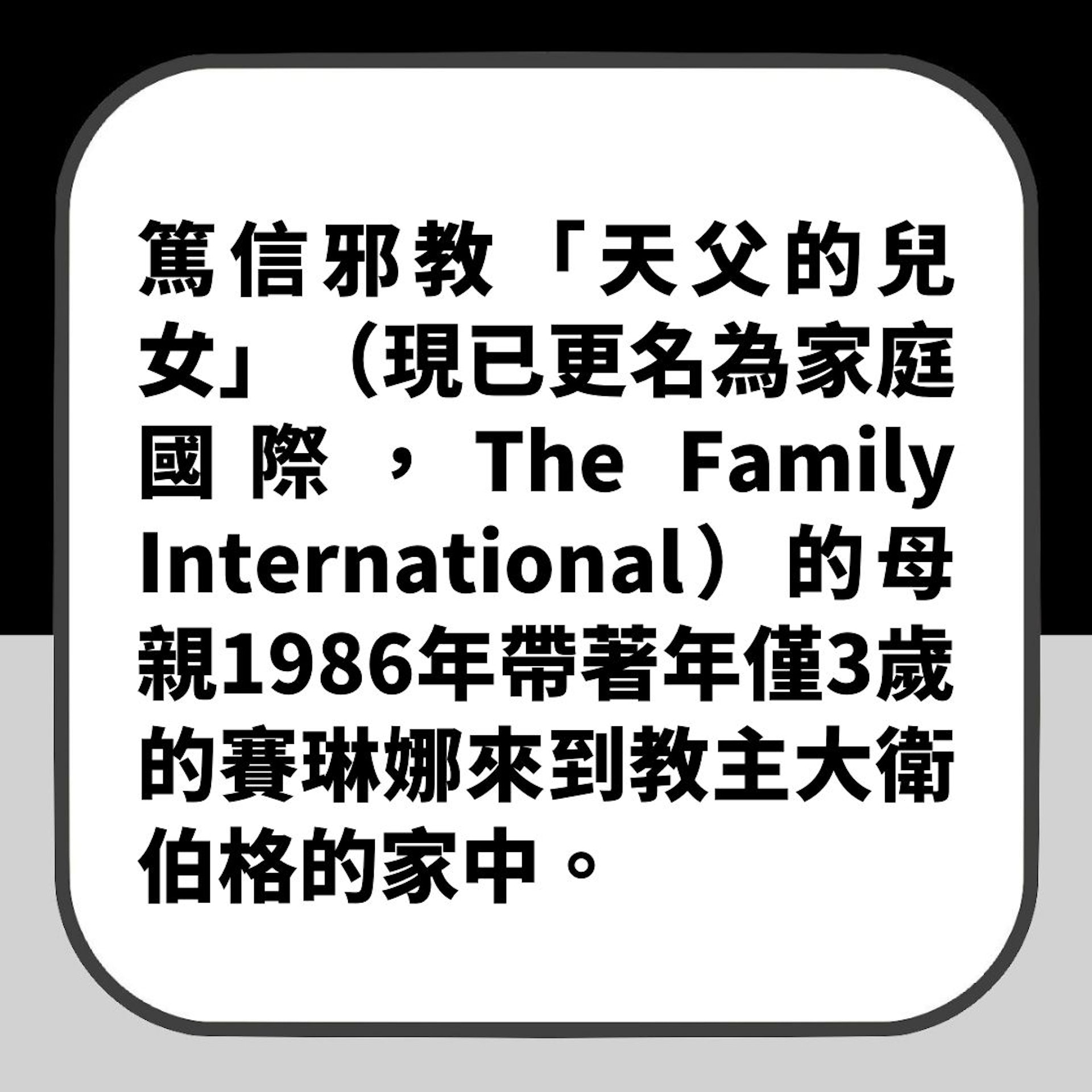 當時大衛伯格已經67歲,賽琳娜3歲生日當天卻得和他結婚,小指被戴上一個成人尺寸的心形婚戒,而身為教徒的父母甚至為此興奮不已。如今她仍留着那個象徵被教主控制的戒指,不過她只當它是長年受虐的證據。' \1 q) e% \" A% r