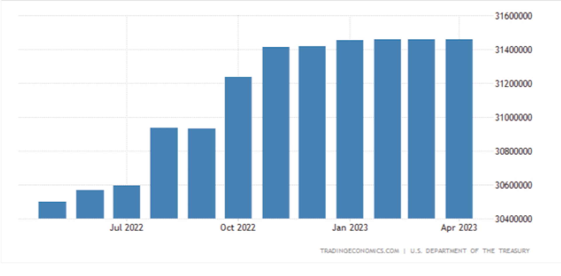 " ?% l( n0 l$ w美國債務今年以來已突破31兆美元。(trading economics)