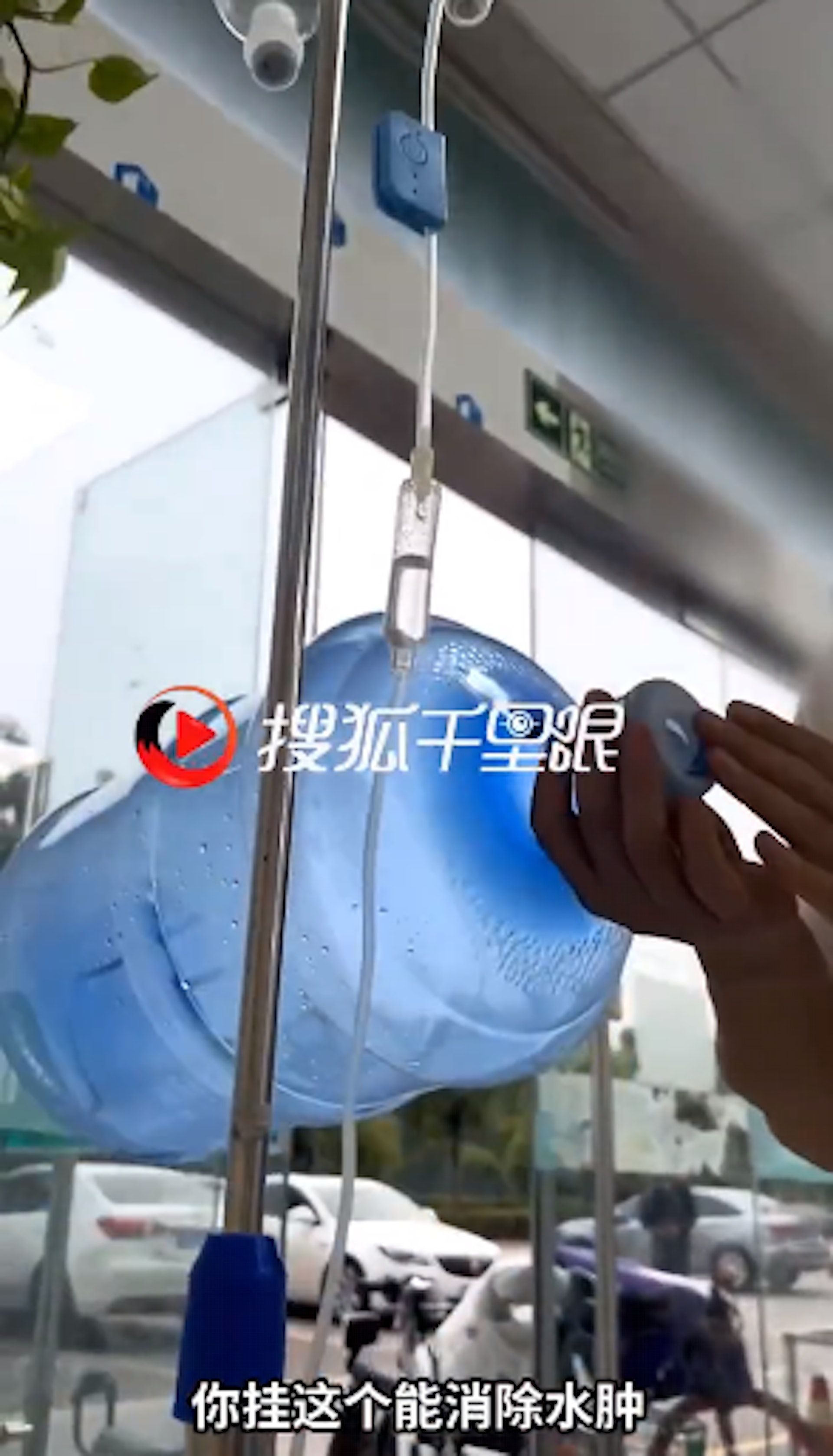 江蘇連雲港一位女士輸液時,遭陌生男子將輸液管插入水桶。(影片截圖)7 F3 `6 z2 Y6 g: ^