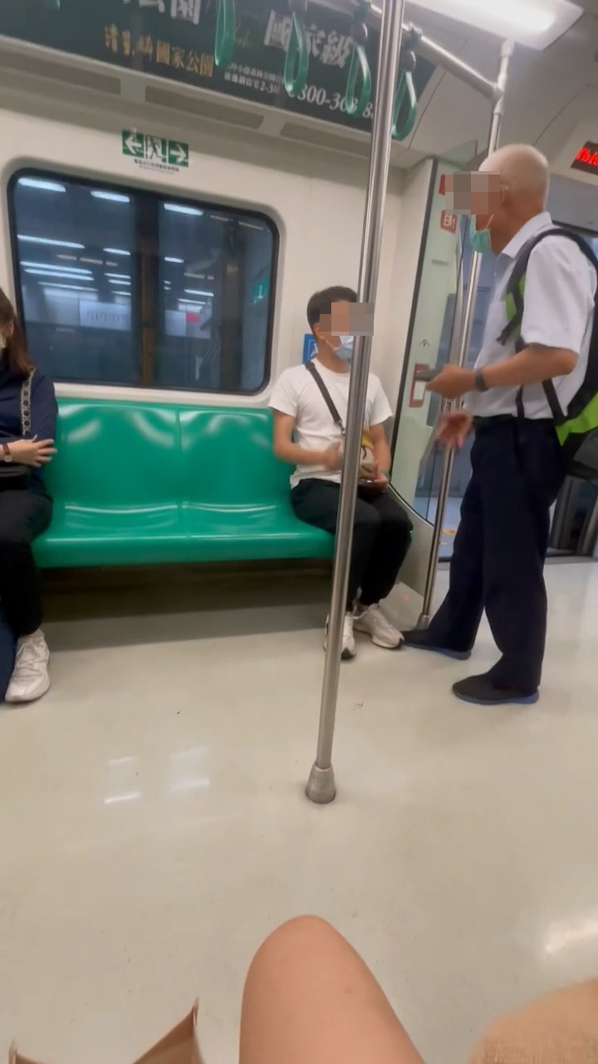 有台灣女生於網上發布影片,指近日乘搭捷運時見到有老伯要年輕男子讓出「博愛座(關發座)」位置。(影片截圖)