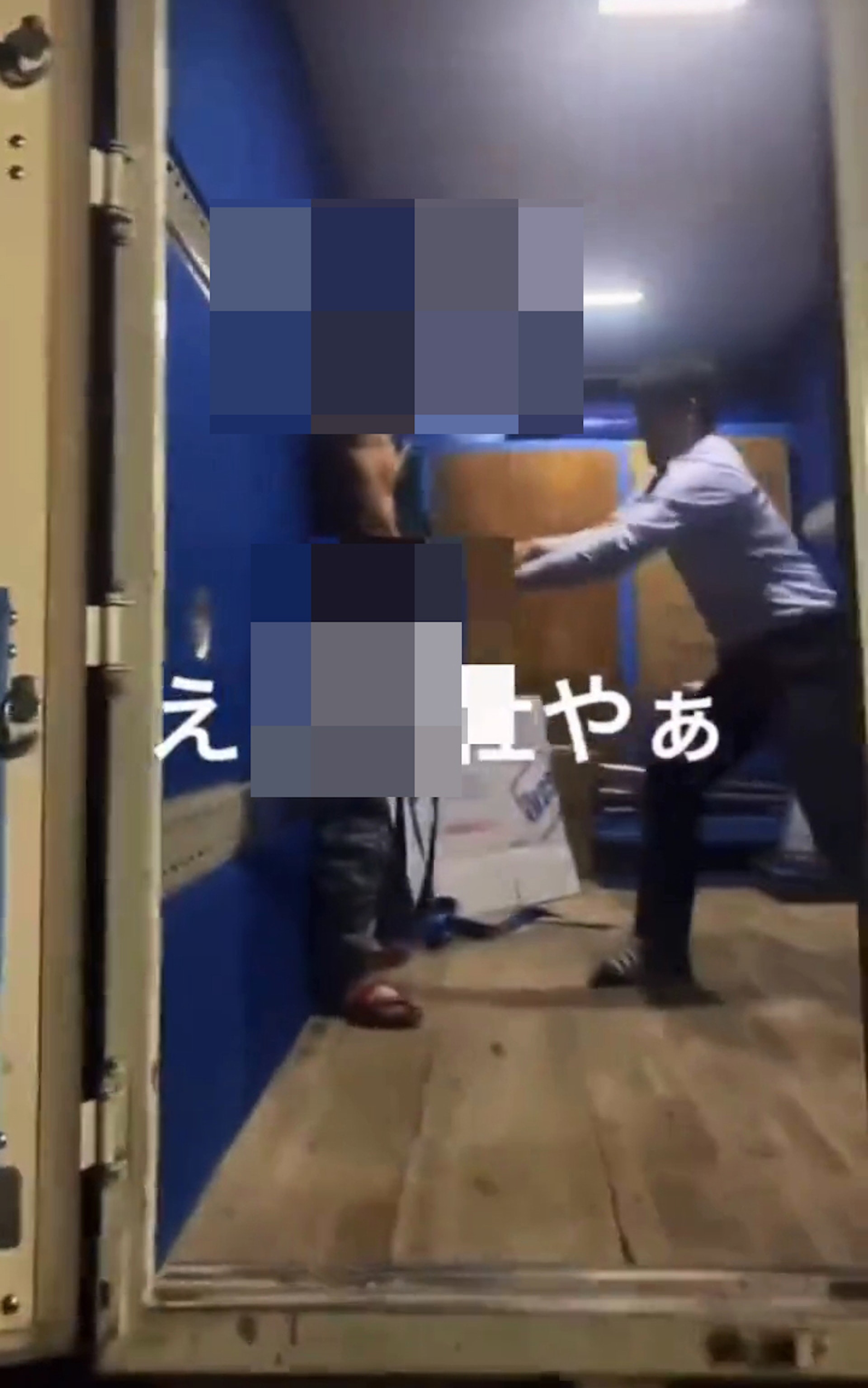 4 o/ c) W' A$ ltvb now,tvbnow,bttvb日本最近爆出職場欺凌事件,有搬屋公司職員全裸被綁在貨車上,有同事拉彈力帶攻擊其下體。(Twitter「滝沢ガレソ」影片截圖)