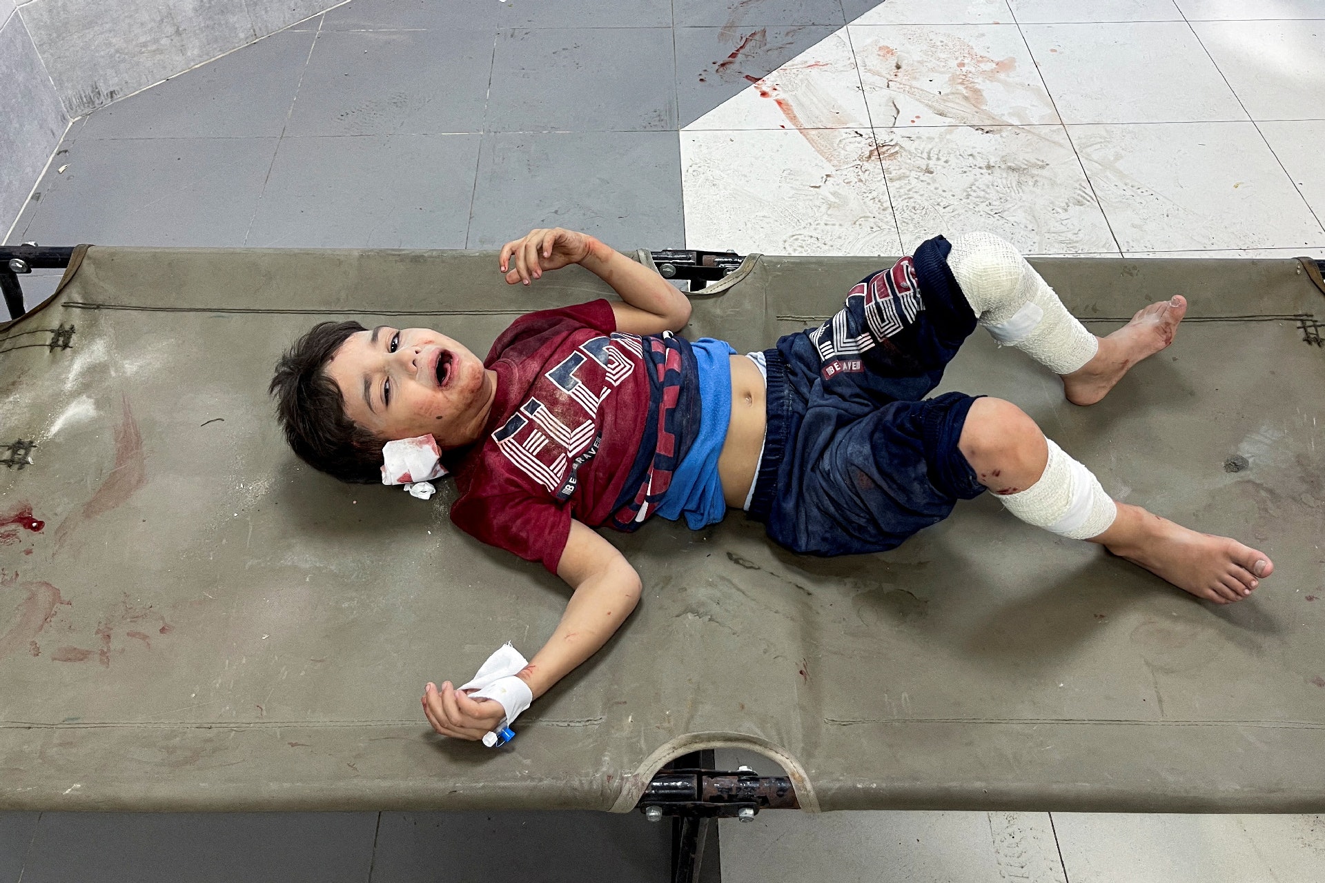 10月23日,加沙市,一名巴勒斯坦小孩於空襲中受傷,躺在希法醫院裏。(Mohammed Al-Masri/路透社)