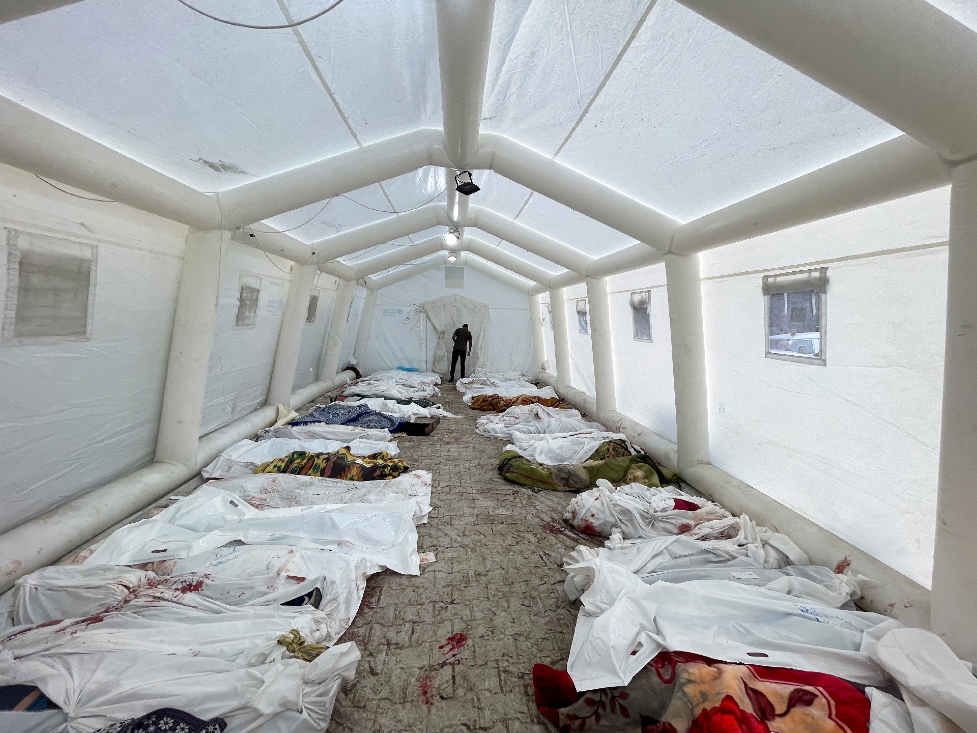 ( P/ v1 w+ ~/ k* ?10月15日,加沙市,希法醫院外的帳幕,擺放着空襲的遇難者。(Mohammed Al-Masri/路透社)tvb now,tvbnow,bttvb" g% t$ K% q6 V4 t: w* V