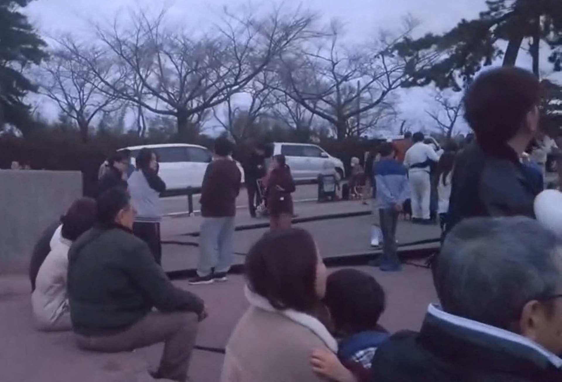 3 \5 Q+ X4 h0 Z/ O) i* }2024年1月1日,日本石川縣能登地區發生7.6級地震,在當局發出海嘯警報後,輪島民眾疏散到地勢較高的一所國中停車場。(Reuters)公仔箱論壇- O+ b' V- k+ @" V( f1 D