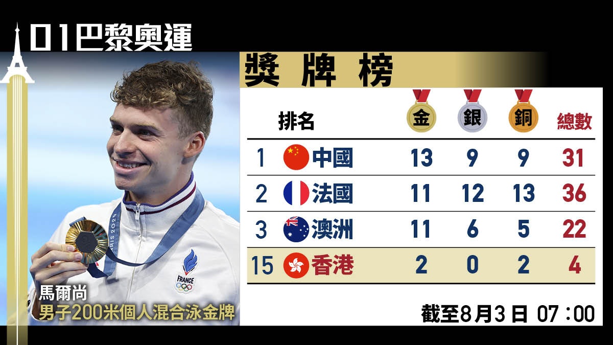 巴黎奧運獎牌榜|中國13金坐榜首拋開法國澳洲 香港2金2銅排15