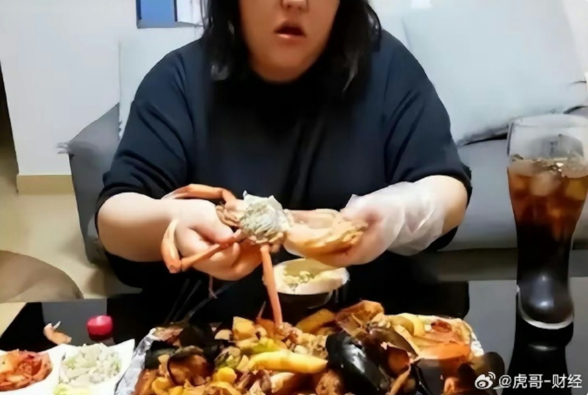 7 g- p! z, M" _! V- r% Y. [5 v( U潘曉婷原本是一名普通的服務員,在看到同學劉琪通過吃播賺取了不菲收入後,她決定投身吃播。(微博截圖)
