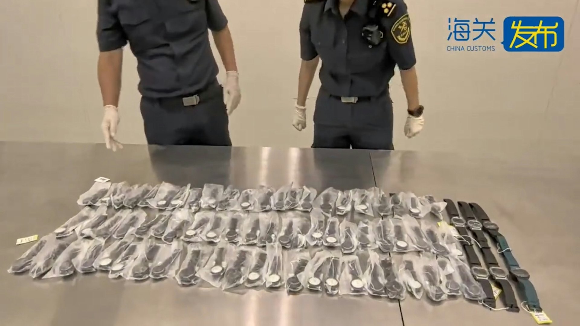 近日皇崗海關在福田口岸旅檢進境(由香港進入內地)渠道查獲一宗旅客小腿綁藏73隻手錶進境案。(中國海關總署微信公眾號)