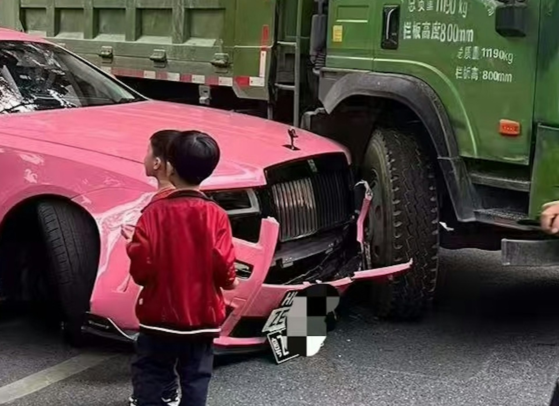 ; R# _, @3 ?. Z* }7 F0 l公仔箱論壇廣東省廣州的一輛貨車4日意外撞上一輛粉色的勞斯萊斯,導致後者的車頭被撞爛。