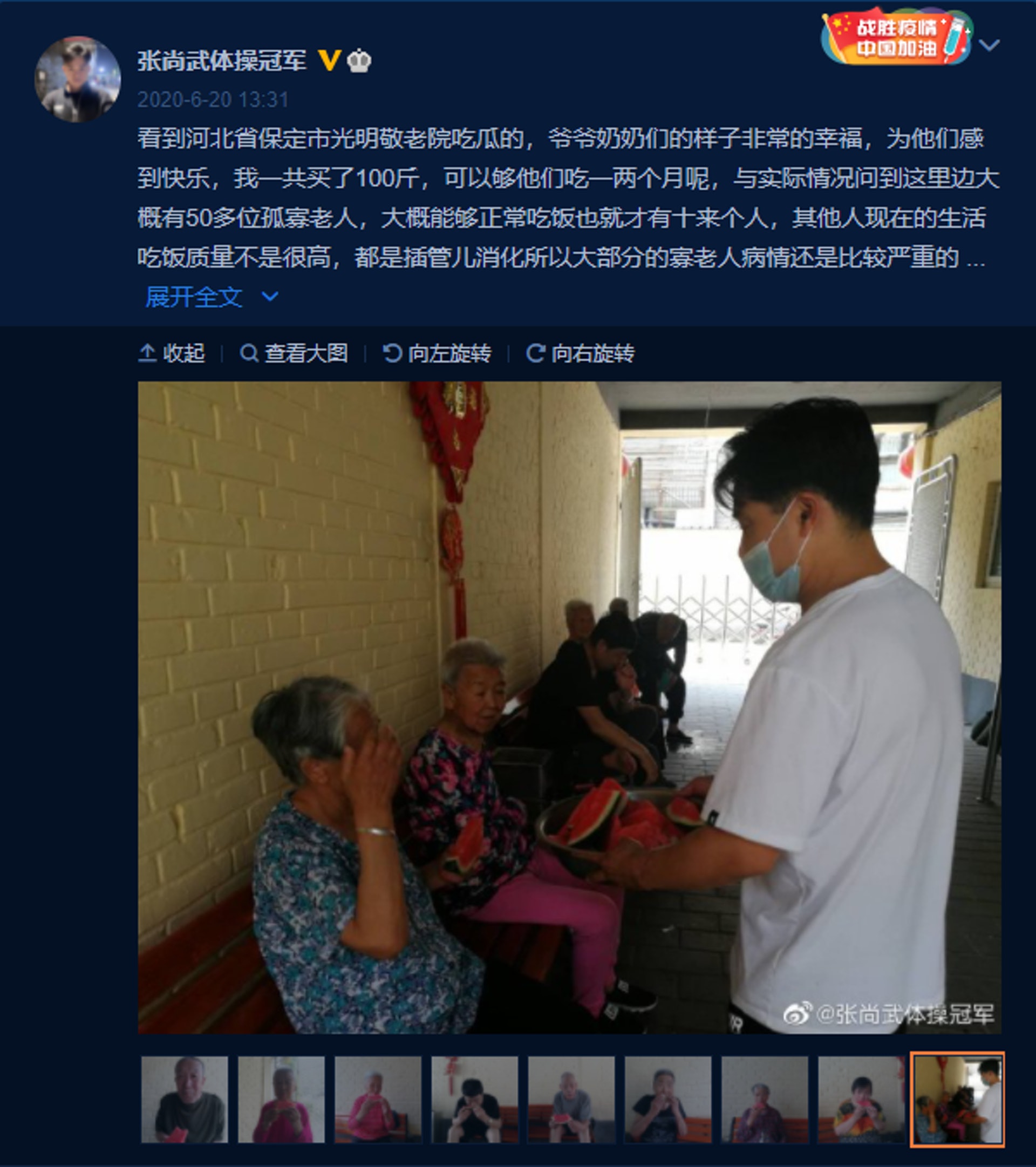 ; w# Y6 F+ P/ w& t0 I! R$ _( s7 n5.39.217.76張尚武常在微博發起公益活動。(微博@张尚武体操冠军)公仔箱論壇2 `+ \, h1 X8 R8 x