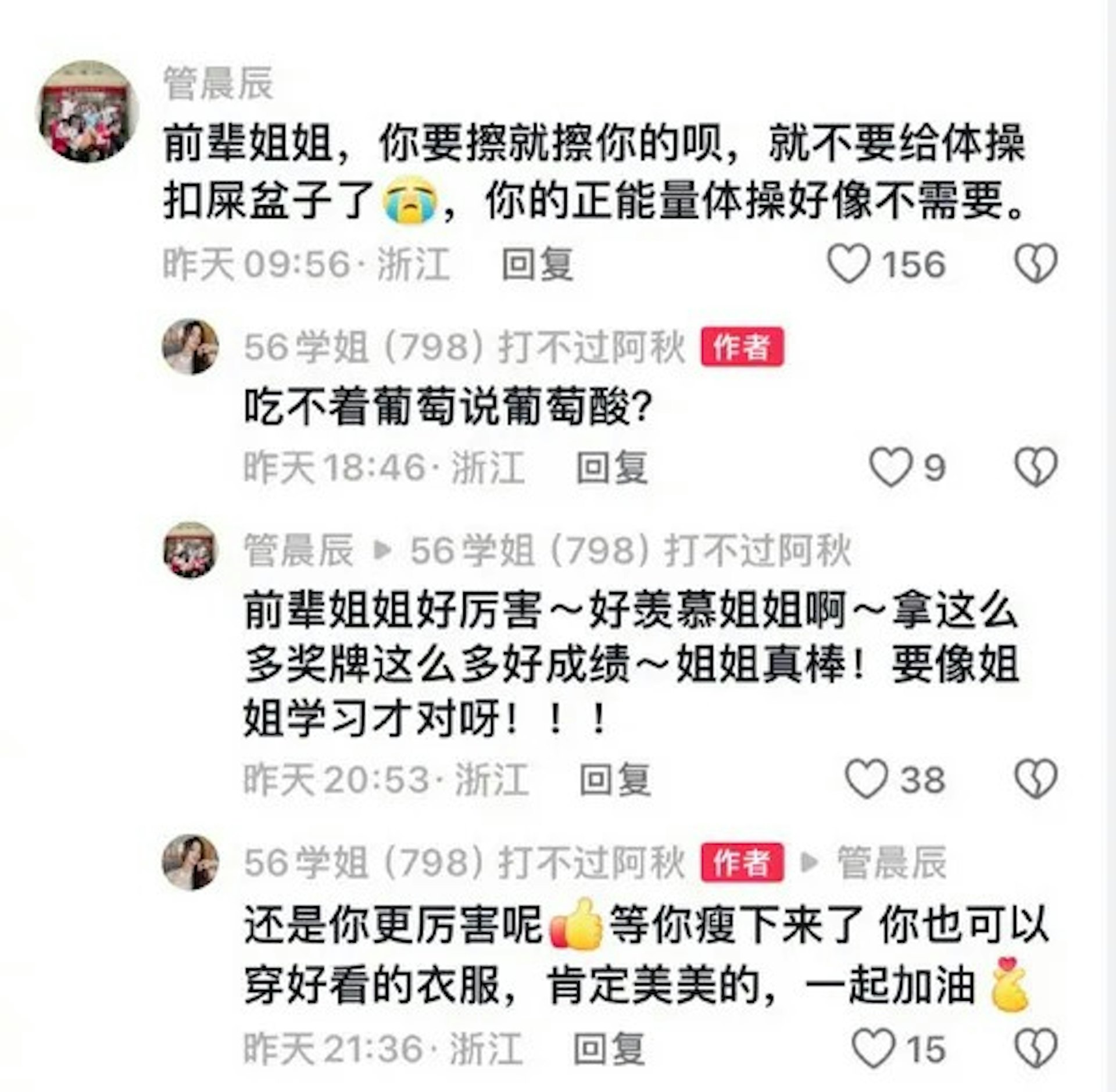前中國體操女隊隊員吳柳芳轉型網紅後,在社交平台發布多條性感熱舞影片,世界冠軍師妹管晨辰則批評她「不要給體操扣屎盆子了」,事件引發爭議,網民反應兩極。5.39.217.76# d. d7 P; b' @7 k) E