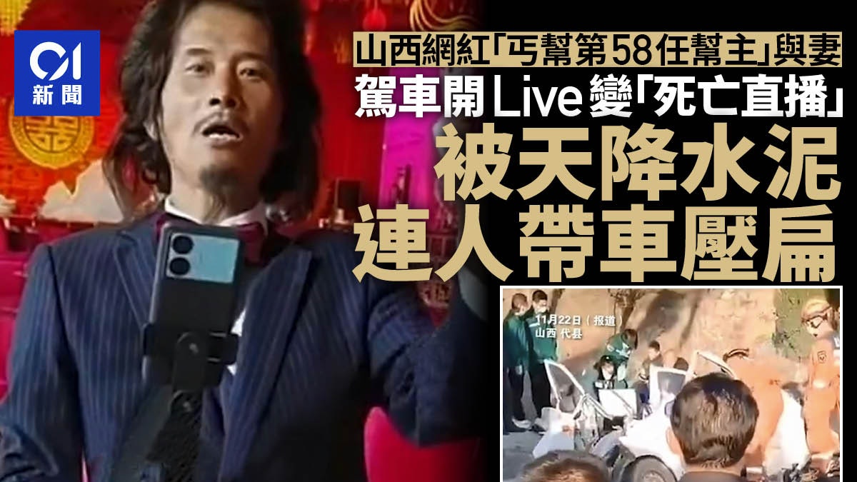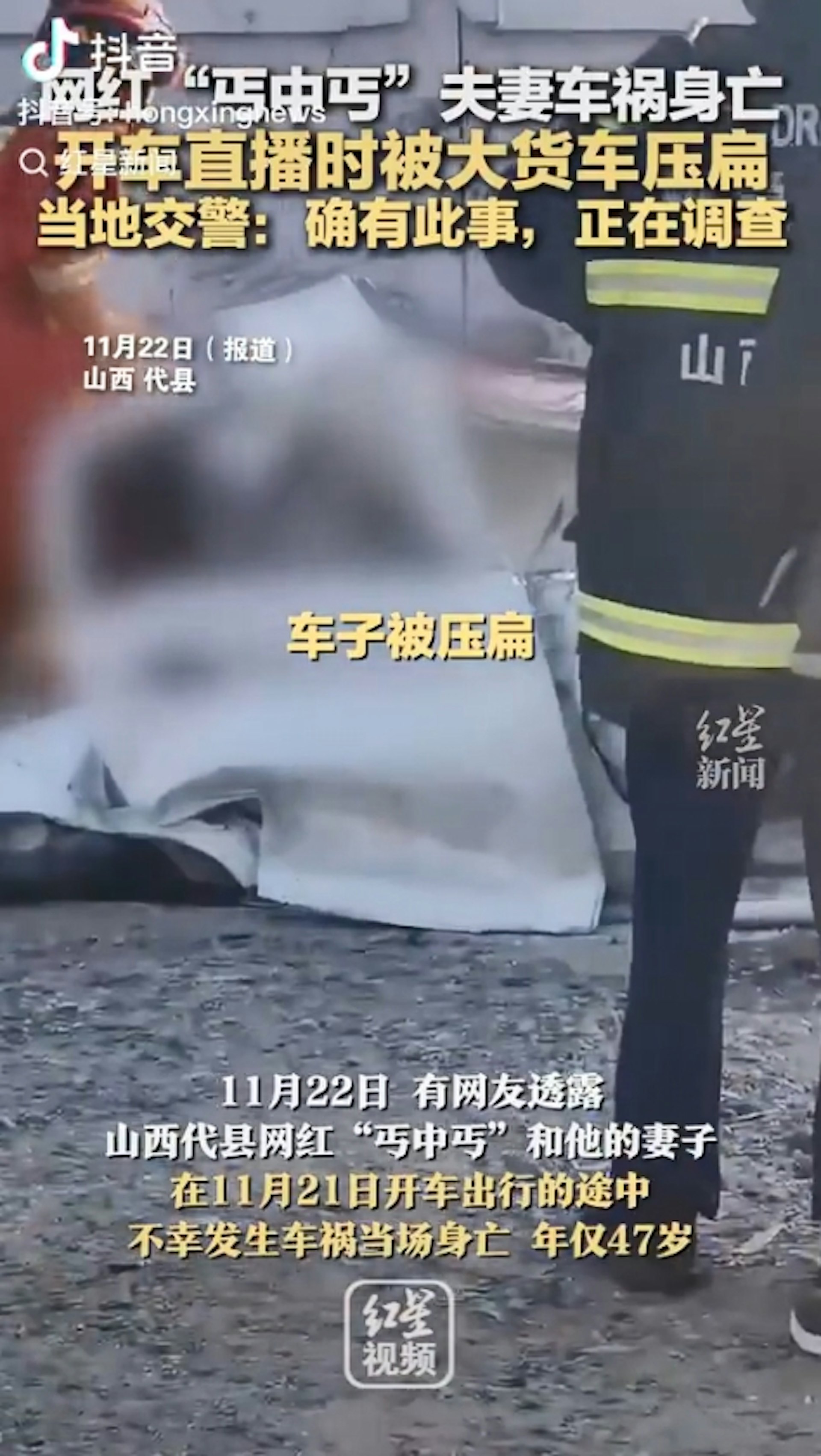 ) }0 i1 R5 Q& e公仔箱論壇自稱是「第58任丐幫幫主」的山西網紅「丐中丐」,夫妻2人21日於開車直播途中不幸身亡。據了解,當時一輛大貨車經過,沒想到重物忽然墜落,砸中他們的車子,導致2人慘死車內,觀看直播的網友也親眼目睹憾事發生。