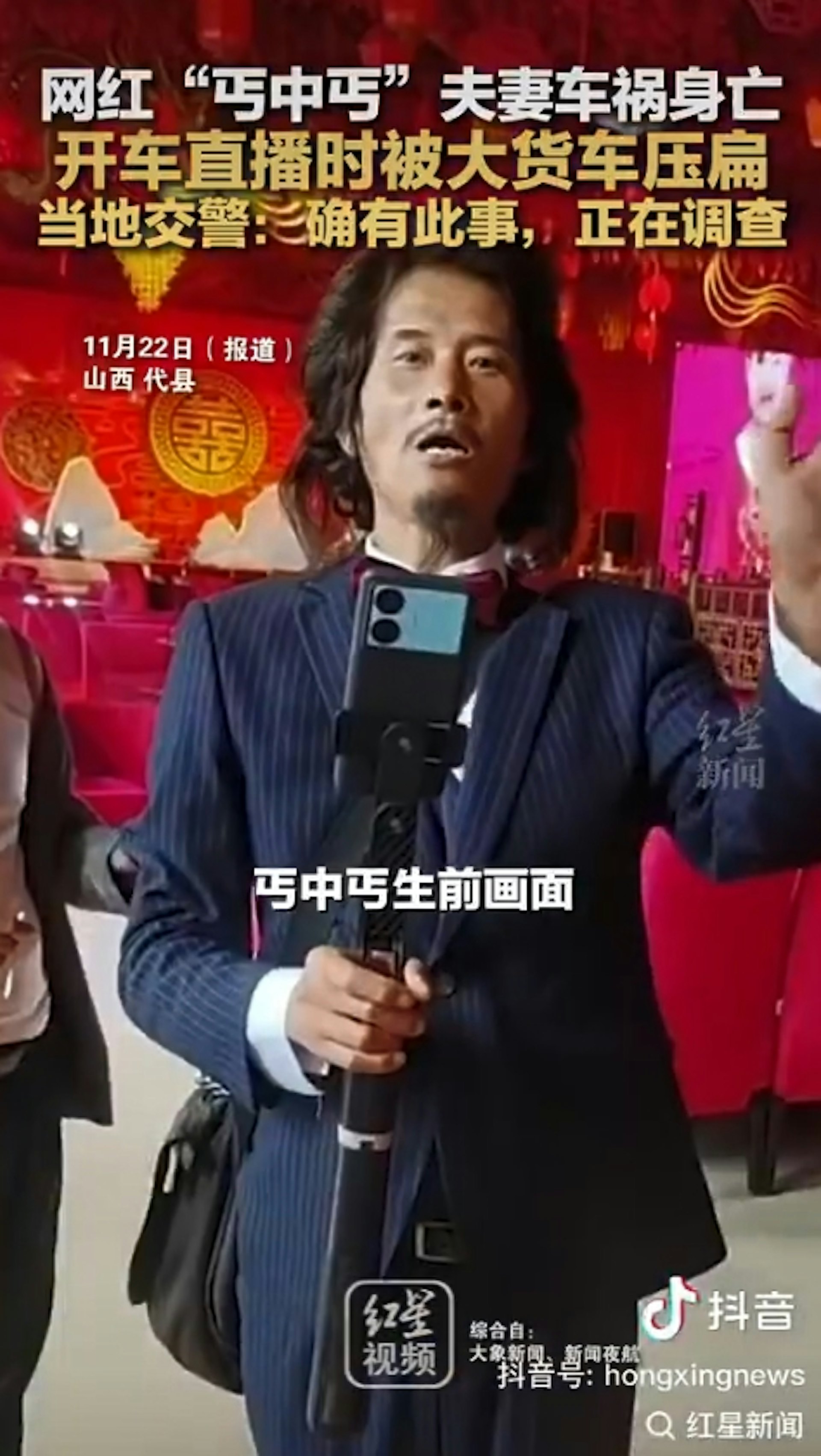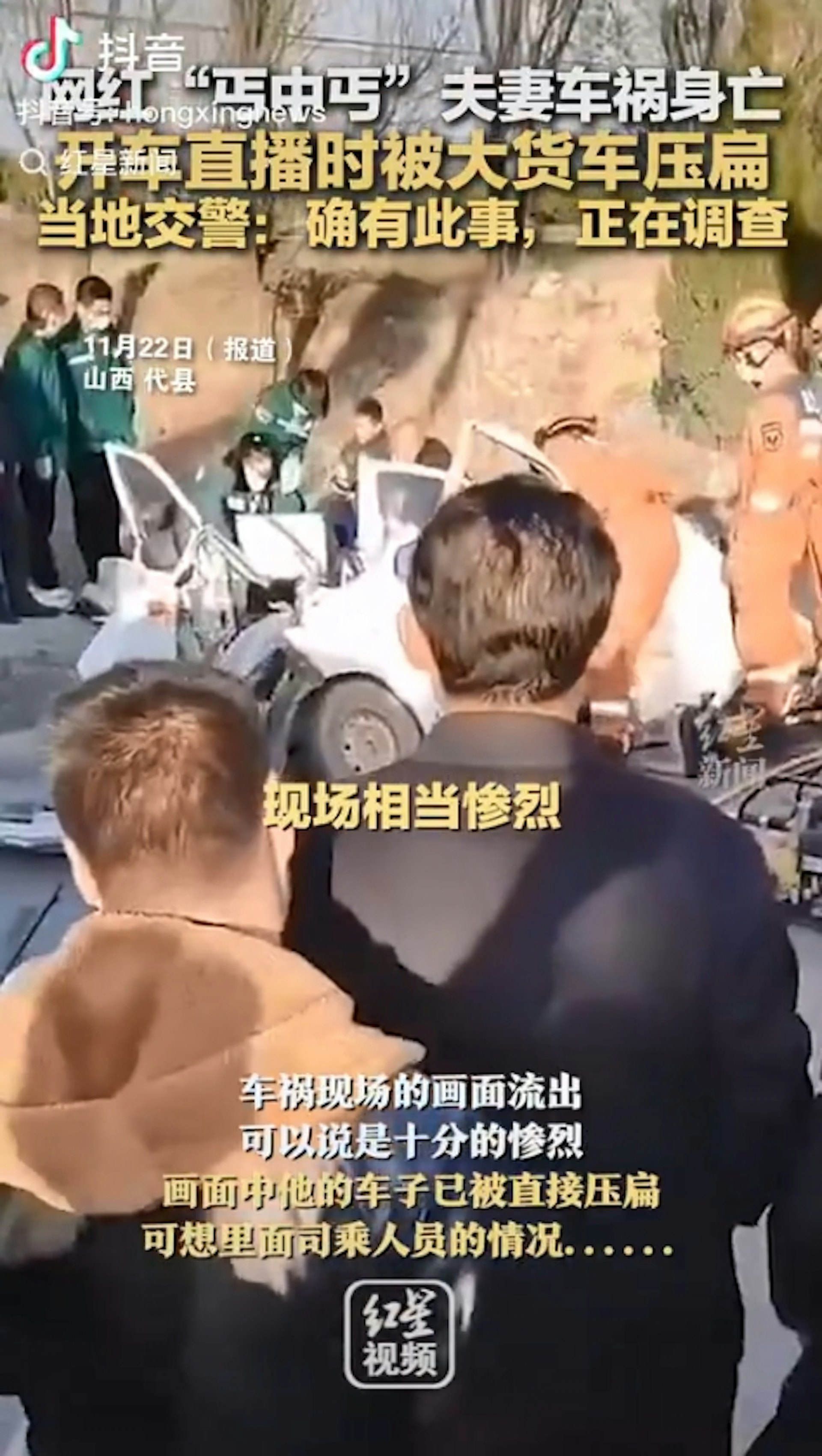 ) W$ U3 t5 J2 v Y) p. k自稱是「第58任丐幫幫主」的山西網紅「丐中丐」,夫妻2人21日於開車直播途中不幸身亡。據了解,當時一輛大貨車經過,沒想到重物忽然墜落,砸中他們的車子,導致2人慘死車內,觀看直播的網友也親眼目睹憾事發生。