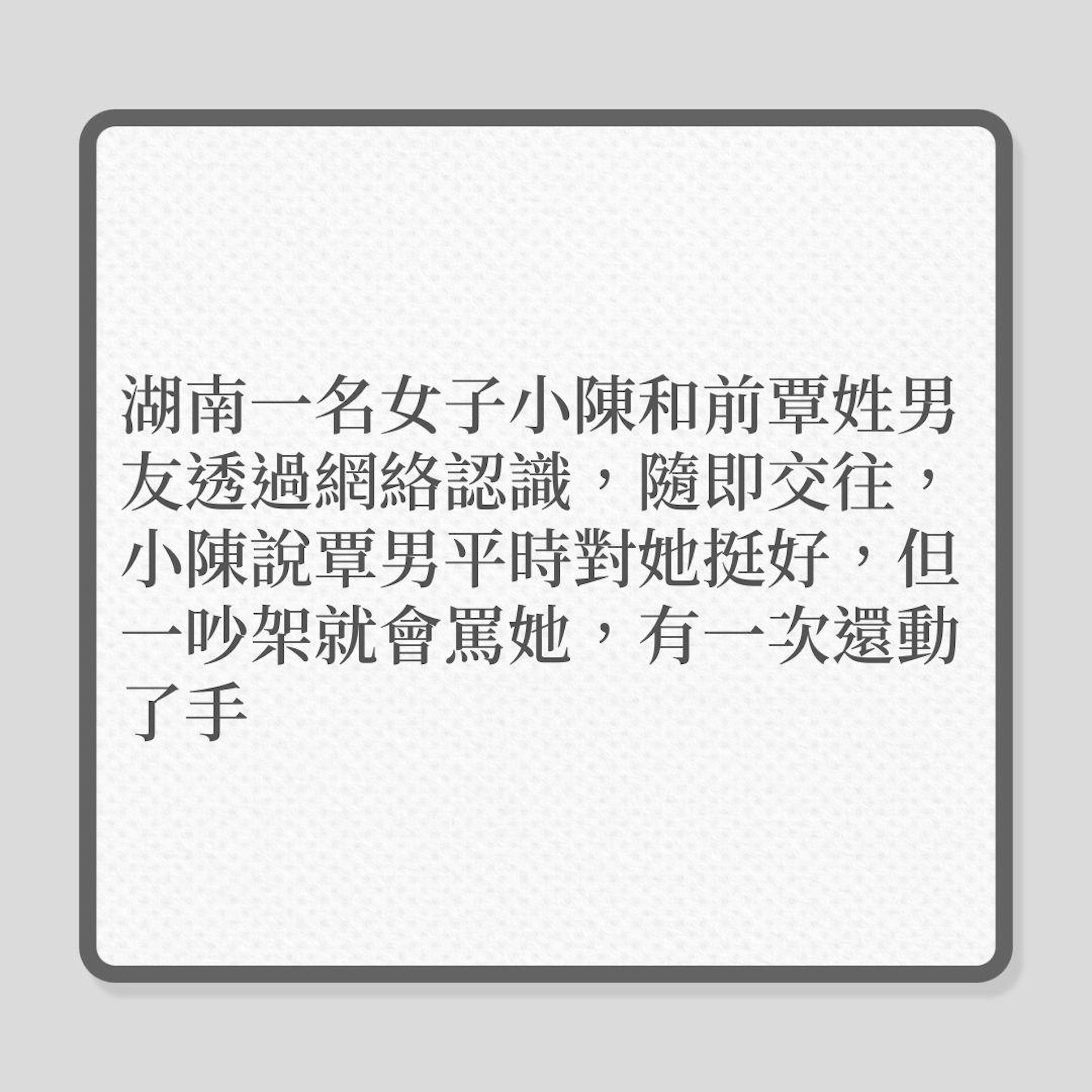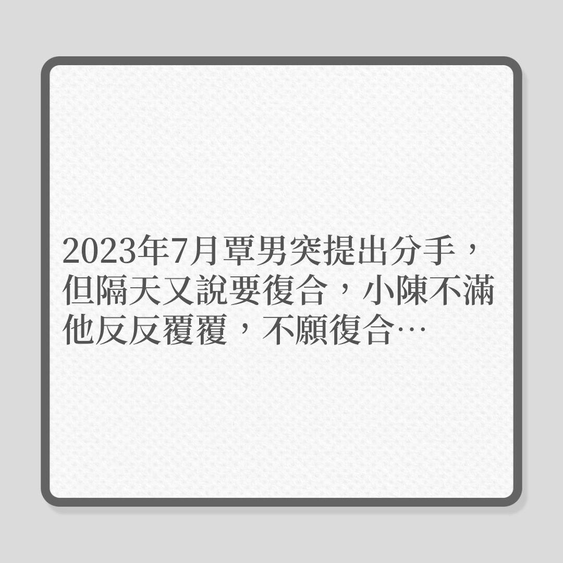 2023年7月覃男突然提出分手,但隔天又說要復合,小陳不滿他反反覆覆,不願復合,豈料覃男竟不斷糾纏,「在微信上說他要跳樓,讓我看着他怎麽死的,說死了也不會放過我。」