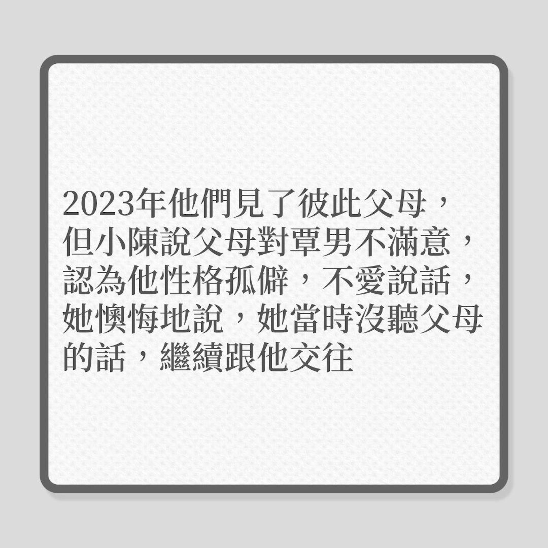《紫牛新聞》報道,這名女子小陳和前覃姓男友透過網絡認識,隨即交往,小陳說,「他平時對我挺好,但一吵架就會罵我,有一次還動了手。」2023年他們見了彼此父母,但小陳說她父母對覃男不滿意,認為他性格孤僻,不愛說話,她懊悔地說,「我沒有聽父母的話,繼續跟他交往。」公仔箱論壇7 |) u" o; E0 \