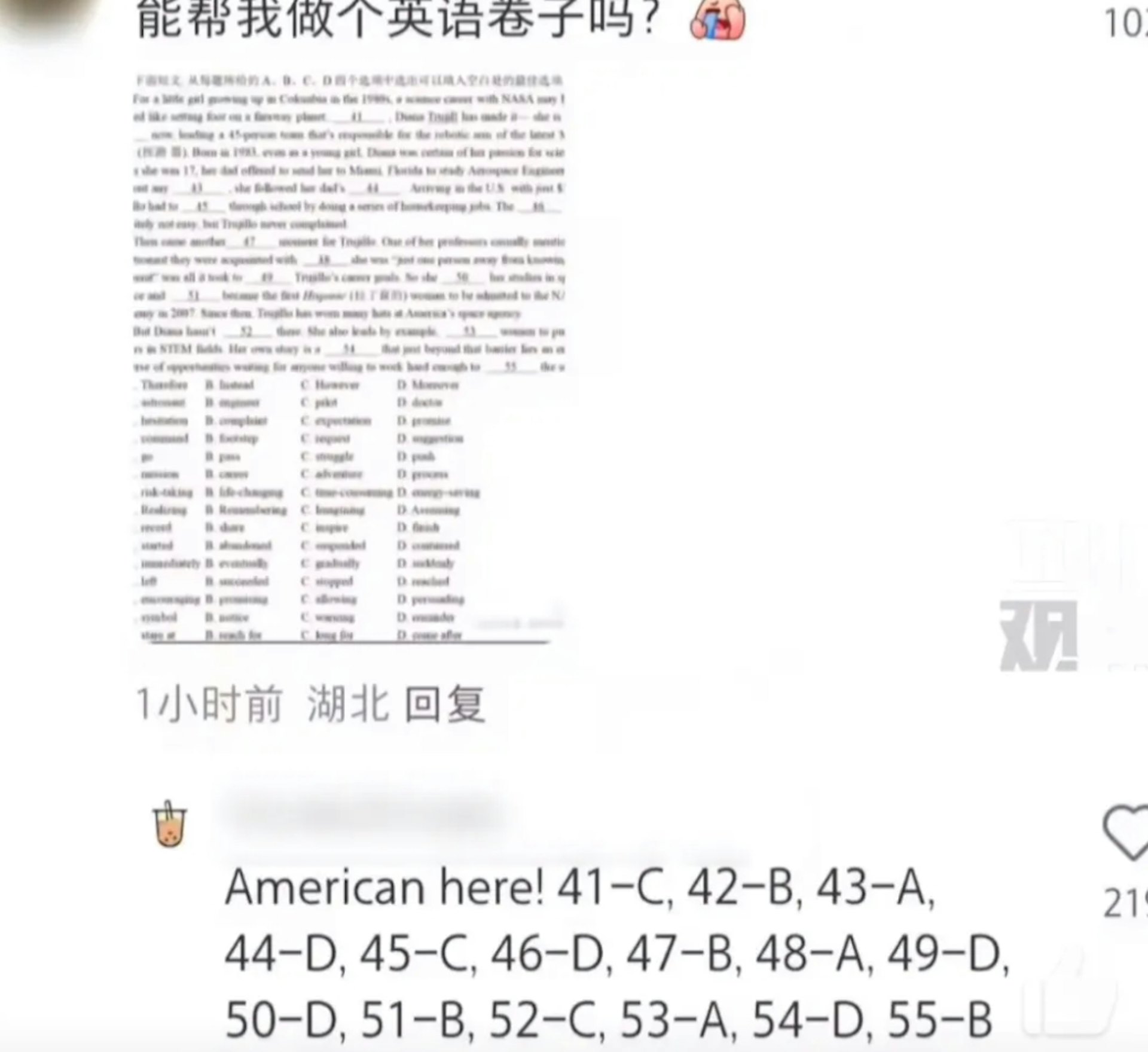 - L# q8 A, [2 U2 f" m& J, i2 \學生黨也加入了這場狂歡,有人po出自己的英文考卷,線上等答案。結果沒想到美國人都答不對英文卷子上的完形填空,5題錯了2個。作為回應,也有美國人發布自己的數學考卷,在線上等一個中國孩子解答。有人感慨,小紅書都快變成「洋人功課幫」了。