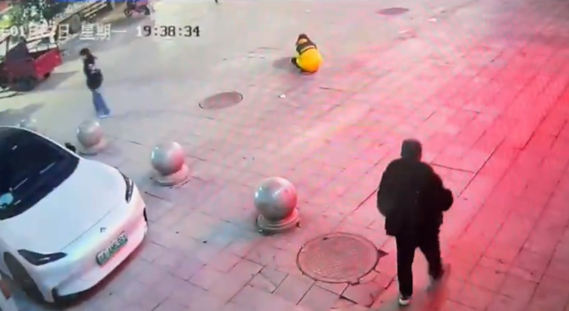 , F9 X: u- s- E. d/ h女童當場被炸飛至遠處倒地,但黃黑色外套已消失不見,疑是在半空中甩脫,可見爆炸威力之強大。(影片截圖)