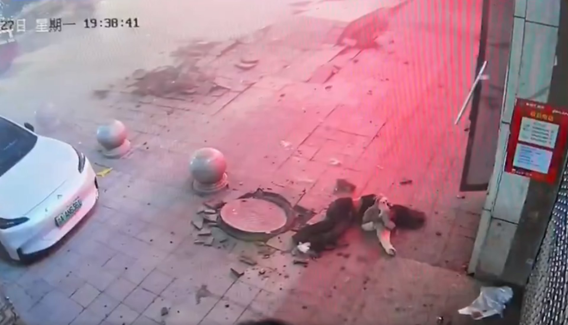 現場發生劇烈爆炸,附近多個渠蓋同時被炸開。(影片截圖)公仔箱論壇, k; i! Q+ Z6 h- j' n0 h! r