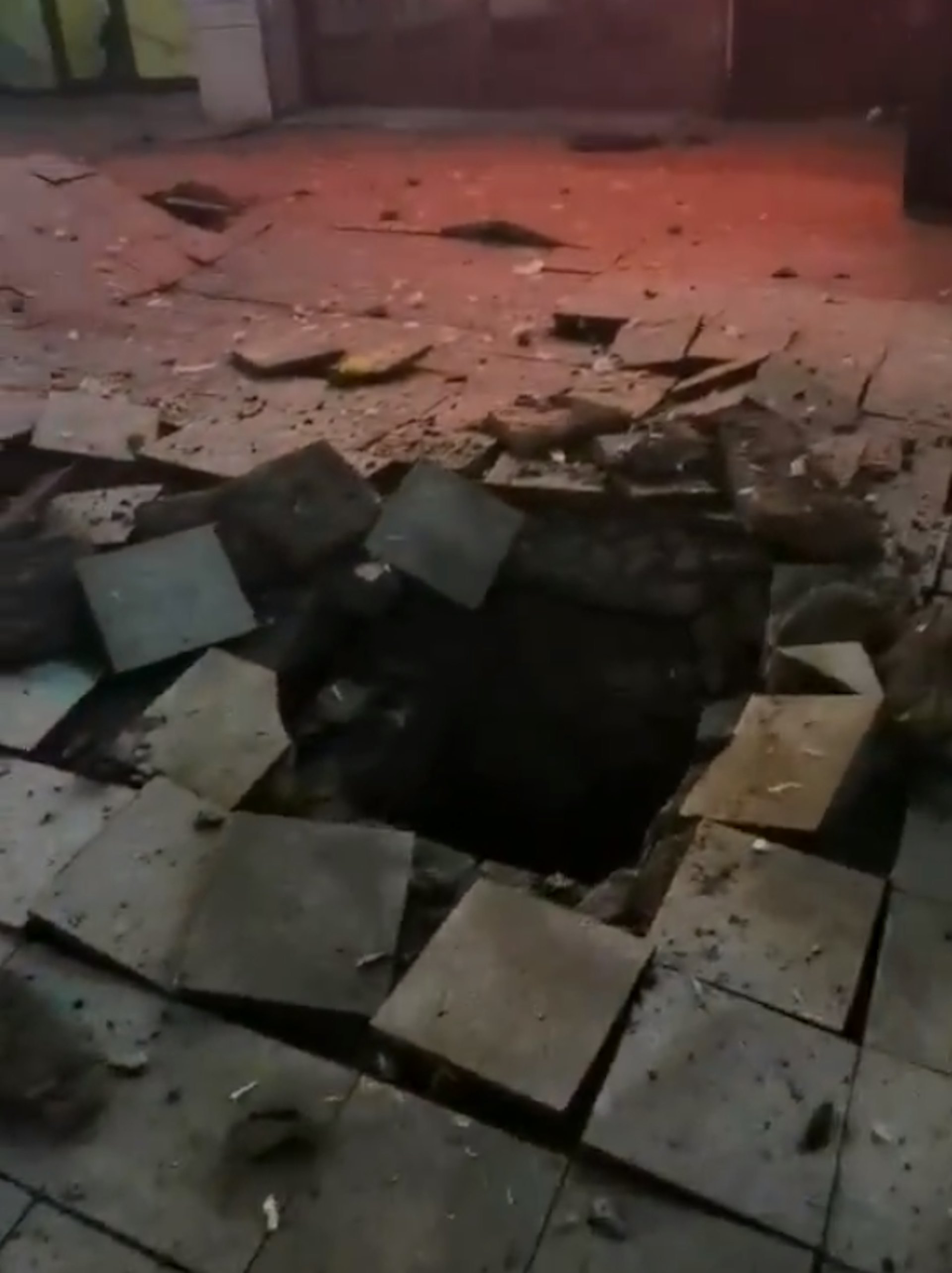 現場多處路面被炸開,一片狼藉。(影片截圖)5.39.217.76+ o; r3 }" t4 u `