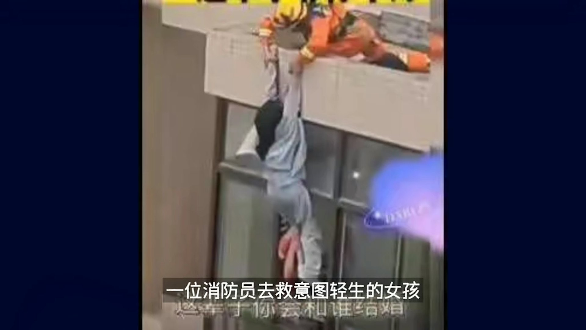 中國一名女子日前因深受失戀之苦,試圖輕生,在她失足之際,消防隊員們聯合將她救下。(微博截圖)公仔箱論壇- P9 v3 G' l& N7 h! F ^