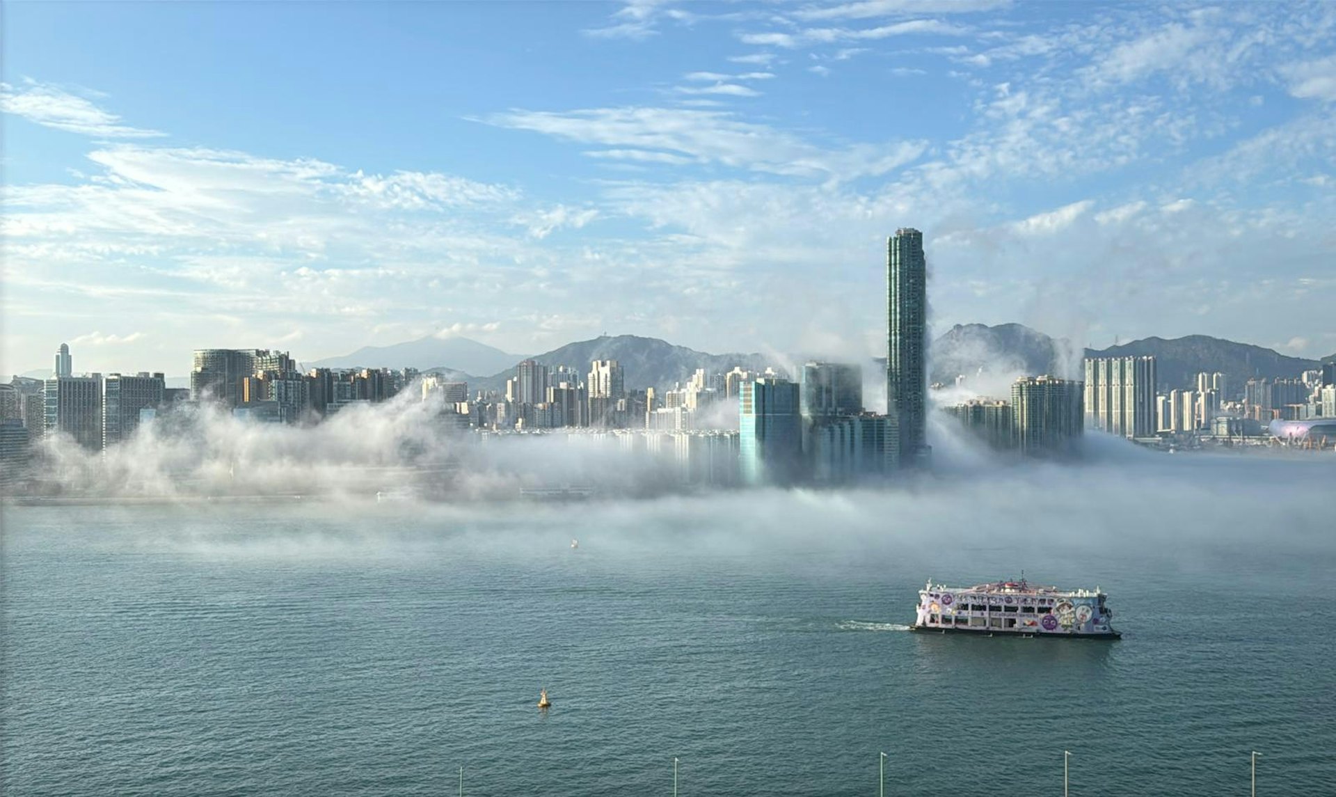 3月2日下午4至5時許,一襲海霧漂進九龍沿岸,在北角拍攝到霧鎖維港美景。(市民陶小姐提供圖片)tvb now,tvbnow,bttvb4 R; w" x% Z4 P2 A