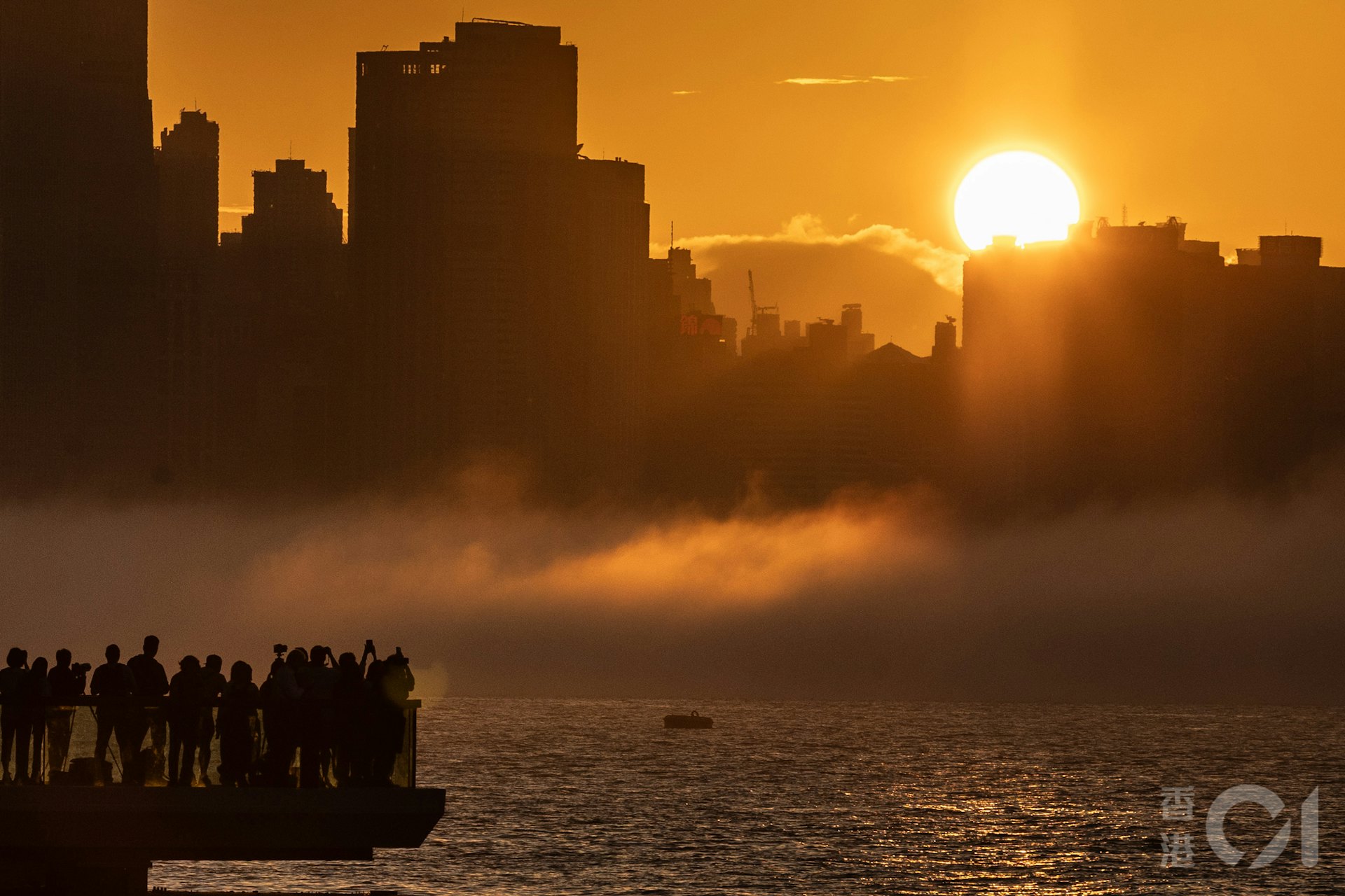 3月2日下午時分,海霧由東面飄入維港,日落時一片金黃。在港島北,有不少市民岸邊拍攝。(廖雁雄攝)